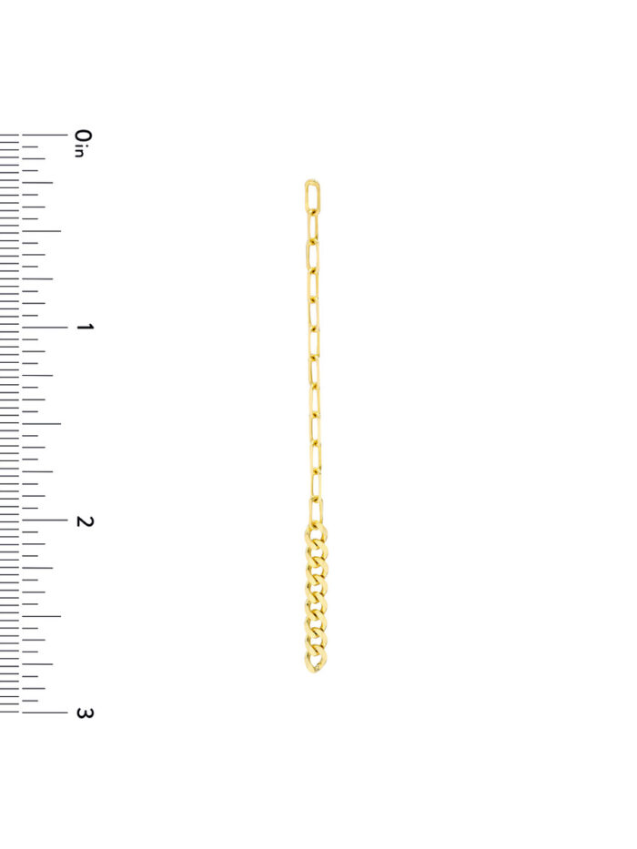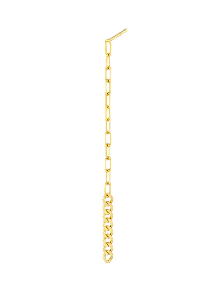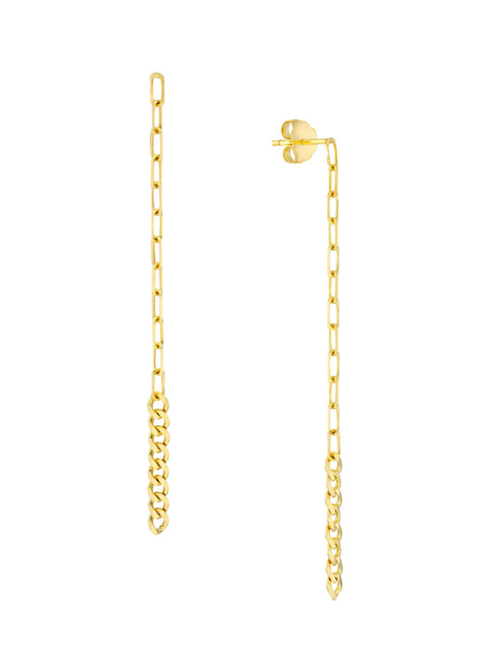 Make a bold fashion statement with our eye-catching 50/50 Paper Clip + Curb Long Drop Earrings. These earrings feature a unique design that combines the modern appeal of a paper clip chain with the classic elegance of a curb chain, creating a truly striking look. Crafted from lustrous 14K yellow gold, these earrings are sure to turn heads.