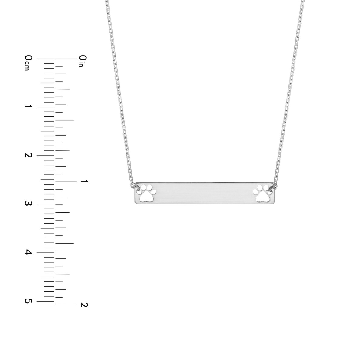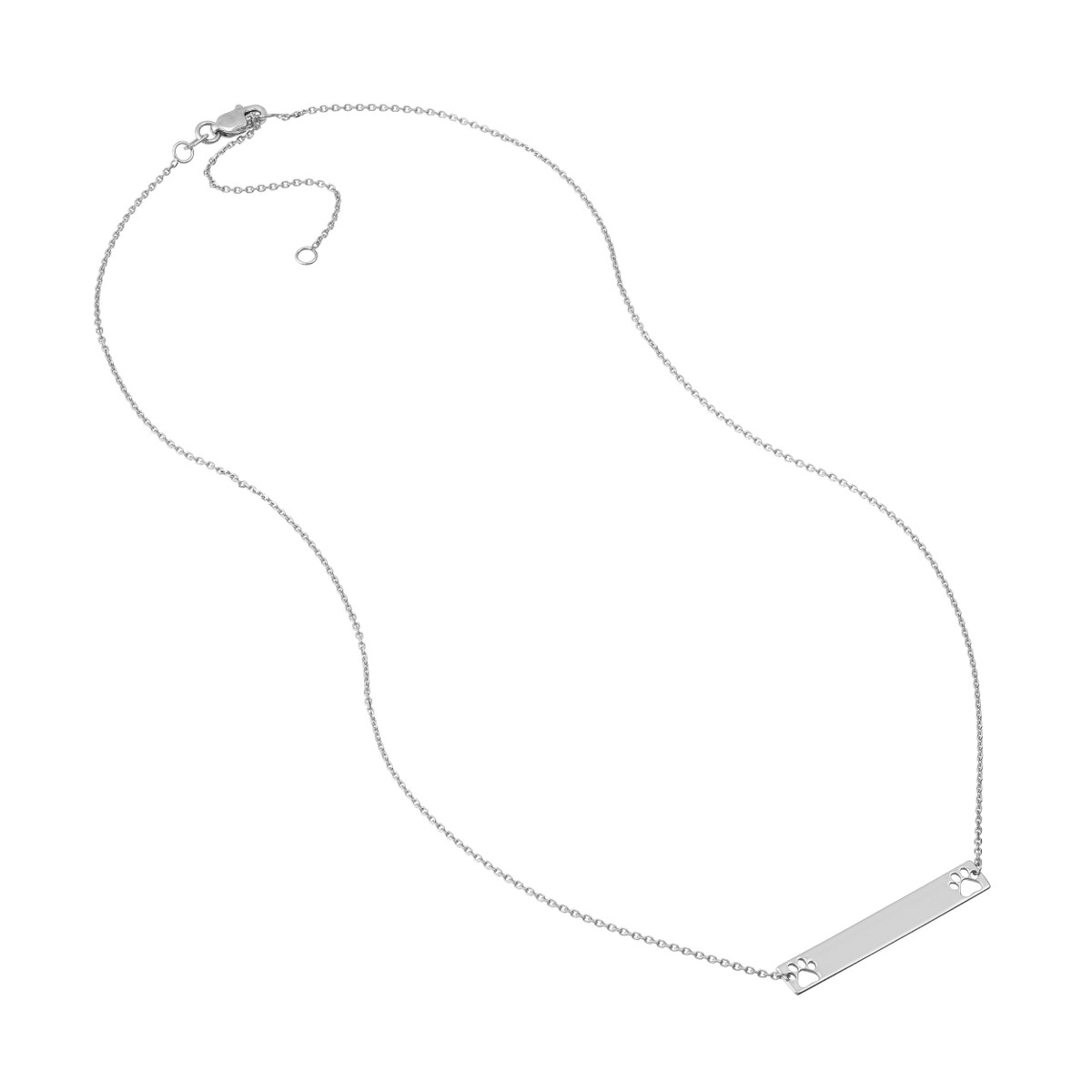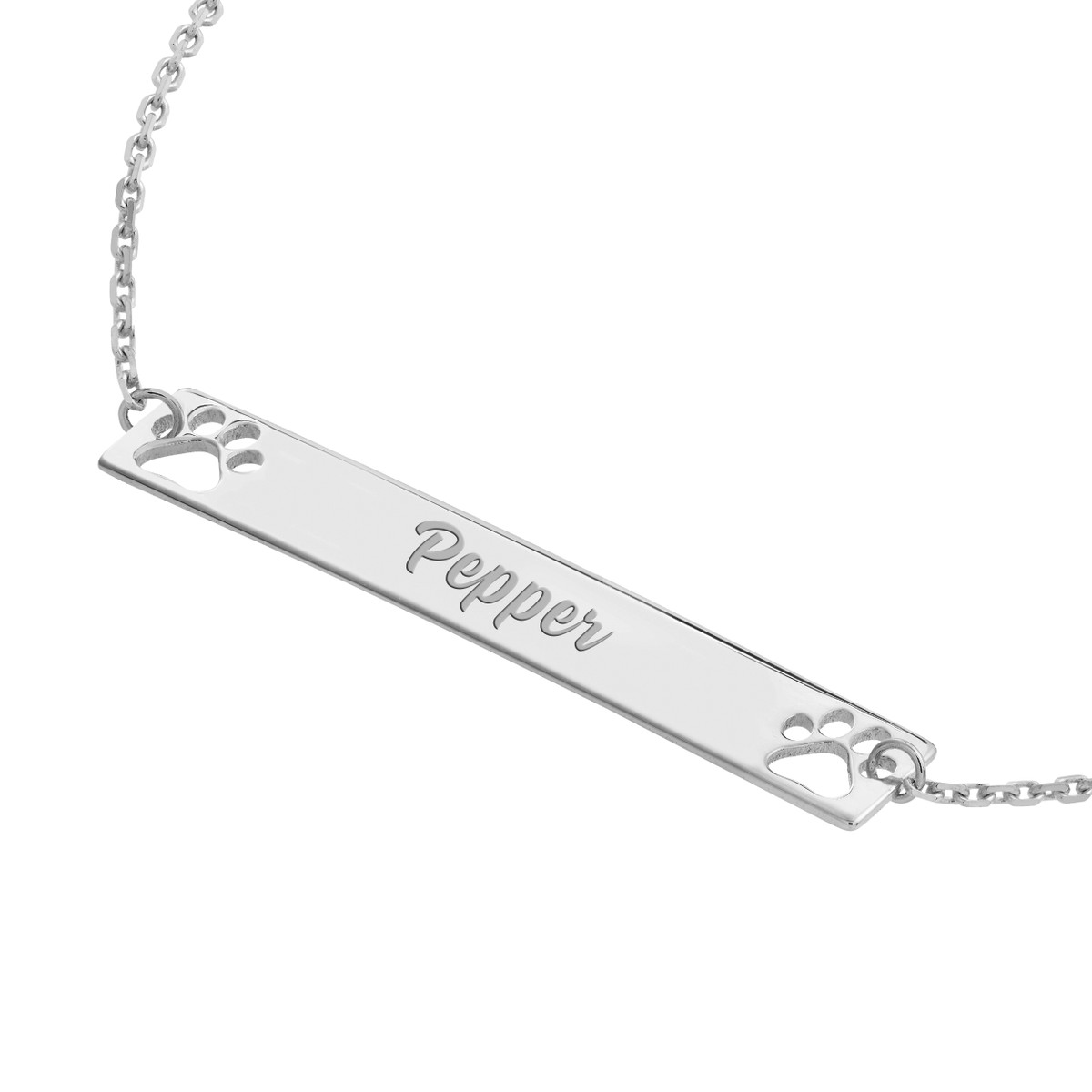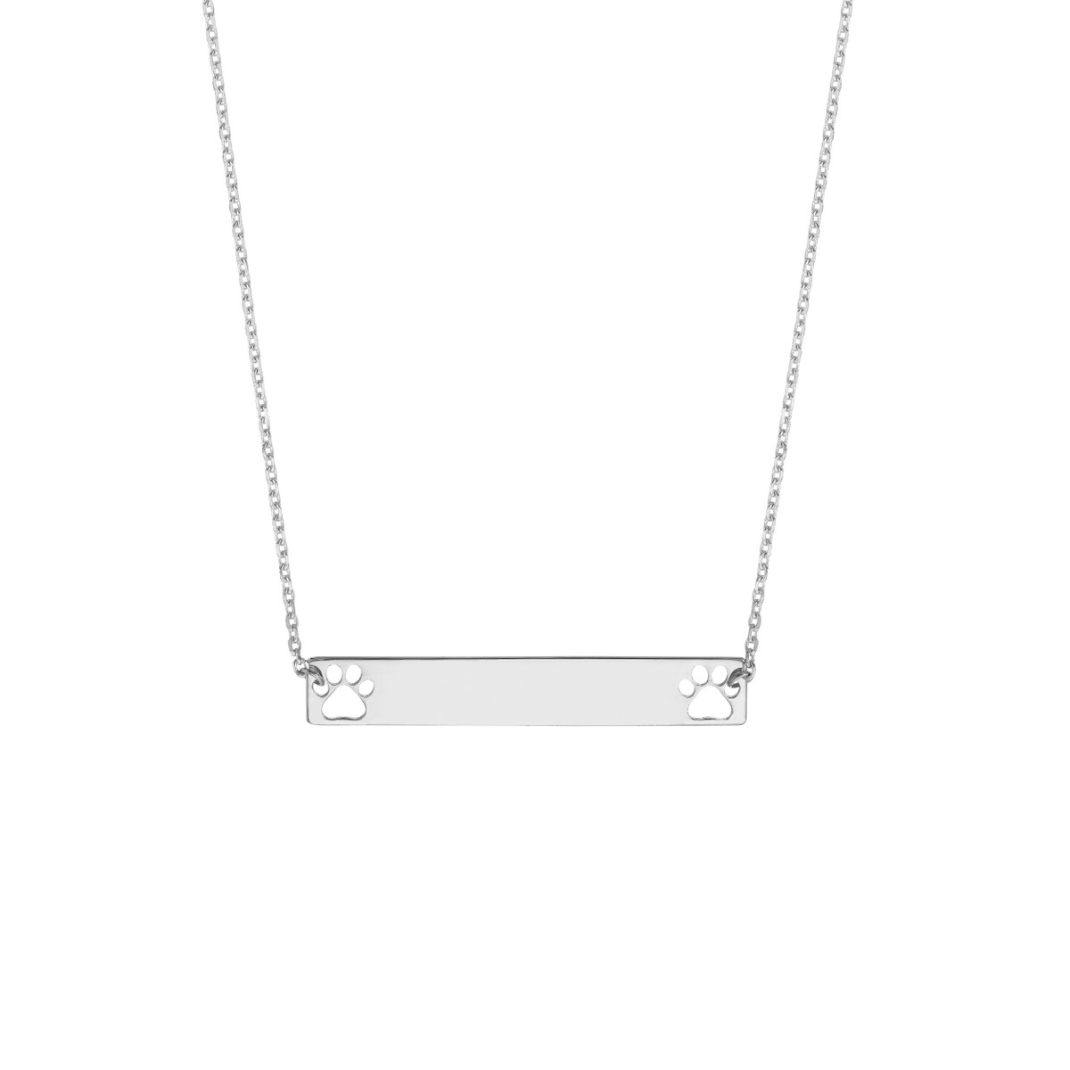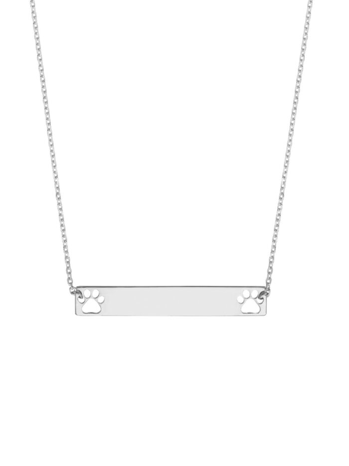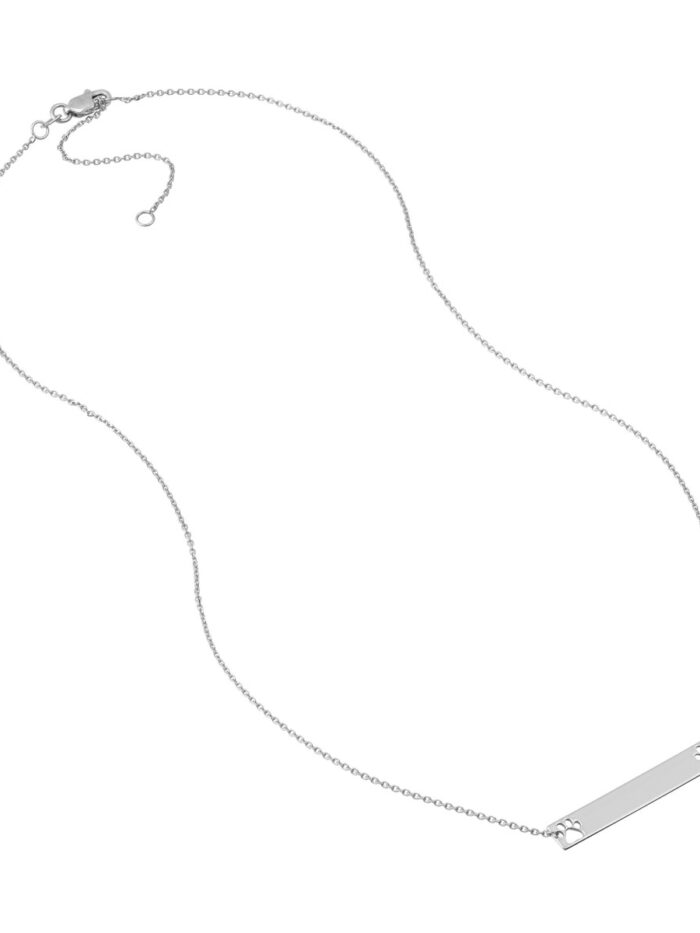 Celebrate your furry friend with our Mini Bar Necklace with Paw Cutouts. This charming piece features a mini bar pendant adorned with two adorable paw print cutouts, making it a heartfelt tribute to your beloved companion. Crafted in sterling silver, the necklace hangs on an elegant cable chain, adjustable for a comfortable fit. It’s a unique and meaningful way to show your love for your pet.