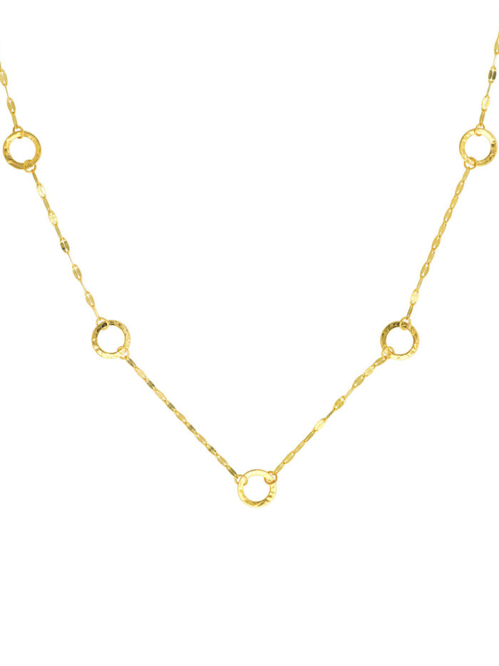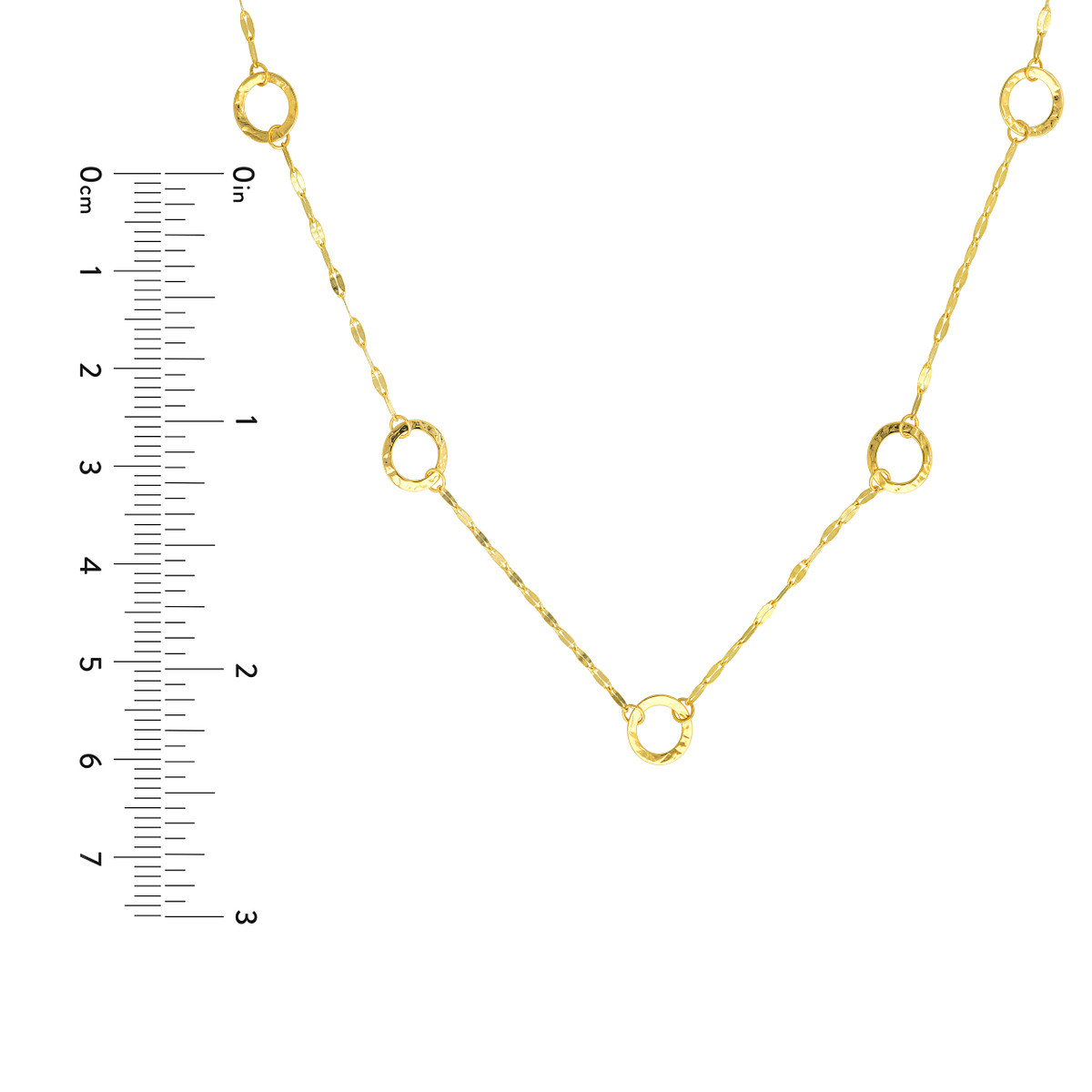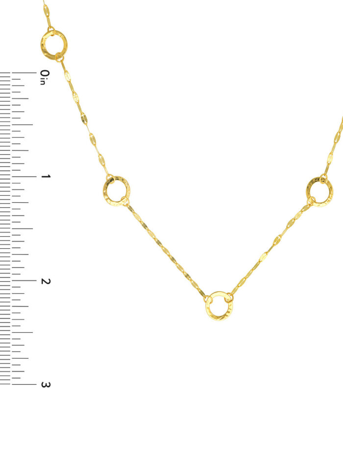 Add a touch of elegance to your everyday attire with the Adjustable Fancy Circle Station Necklace. This beautiful piece features hammered open circle stations that gracefully adorn a delicate fancy chain. Crafted in lustrous 14K yellow gold, each circle adds a unique dimension of texture and shine. The adjustable chain ensures a comfortable and personalized fit, ranging from 16 to 18 inches.