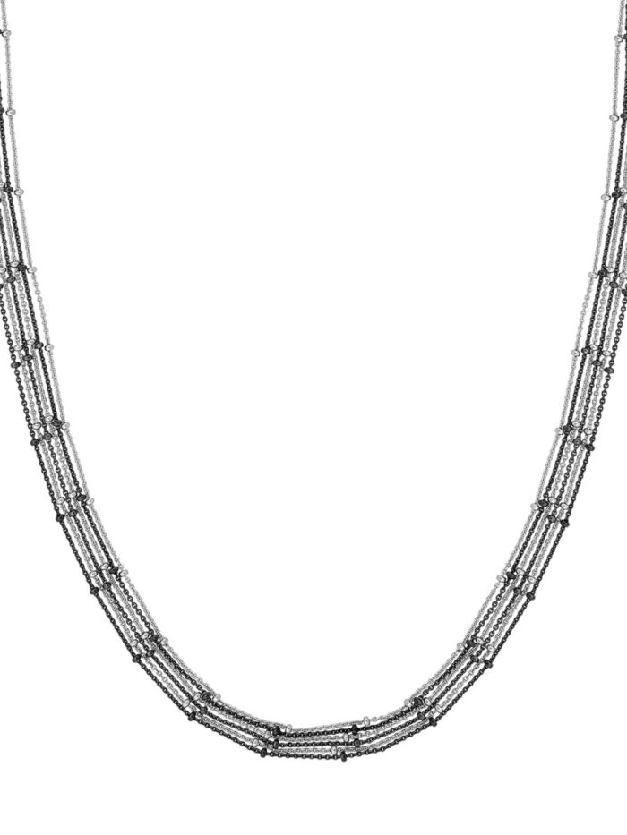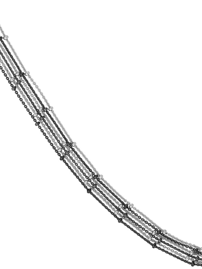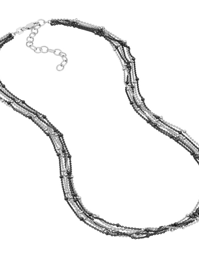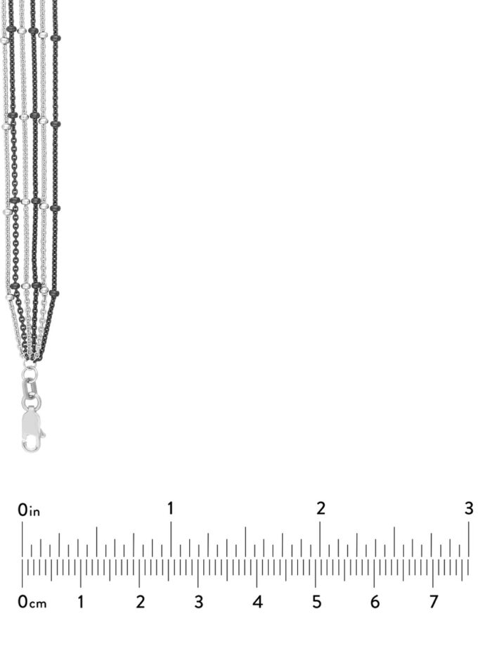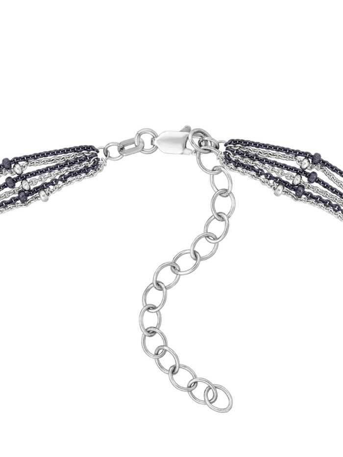 Make a statement with this eye-catching multi-strand saturn chain necklace. Crafted in sterling silver with black accents, it features a unique and modern design that adds a touch of edgy sophistication to any outfit. The adjustable chain allows for a customized fit, while the secure lobster closure ensures it stays in place all day long.