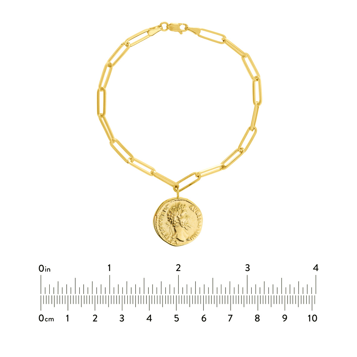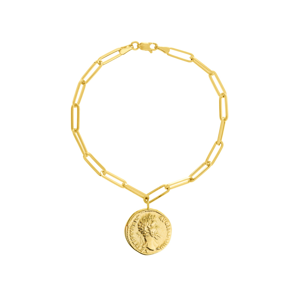 Make a statement with this eye-catching antique coin bracelet, crafted from lustrous 14K yellow gold. The intricate antique coin pendant is beautifully accentuated by a long link chain, creating a bold and unique look. The secure lobster clasp ensures a comfortable and confident fit. This bracelet is sure to spark conversation and become a treasured piece in your jewelry collection.