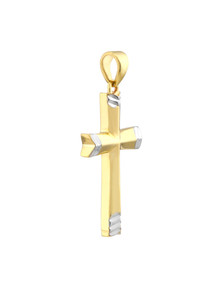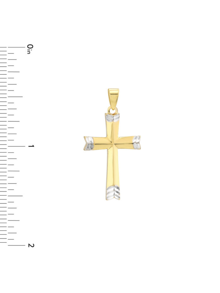 Celebrate your faith with this striking Two Tone Cross pendant featuring a unique arrow design along the edges. Crafted from both lustrous 10K yellow and white gold, it adds a touch of sophistication to any outfit. The pendant’s bail closure allows for easy attachment to your choice of chain.