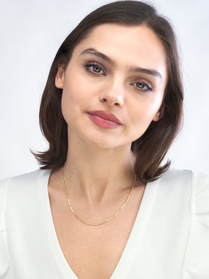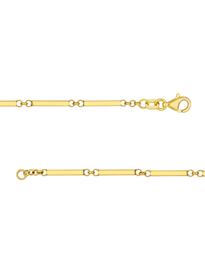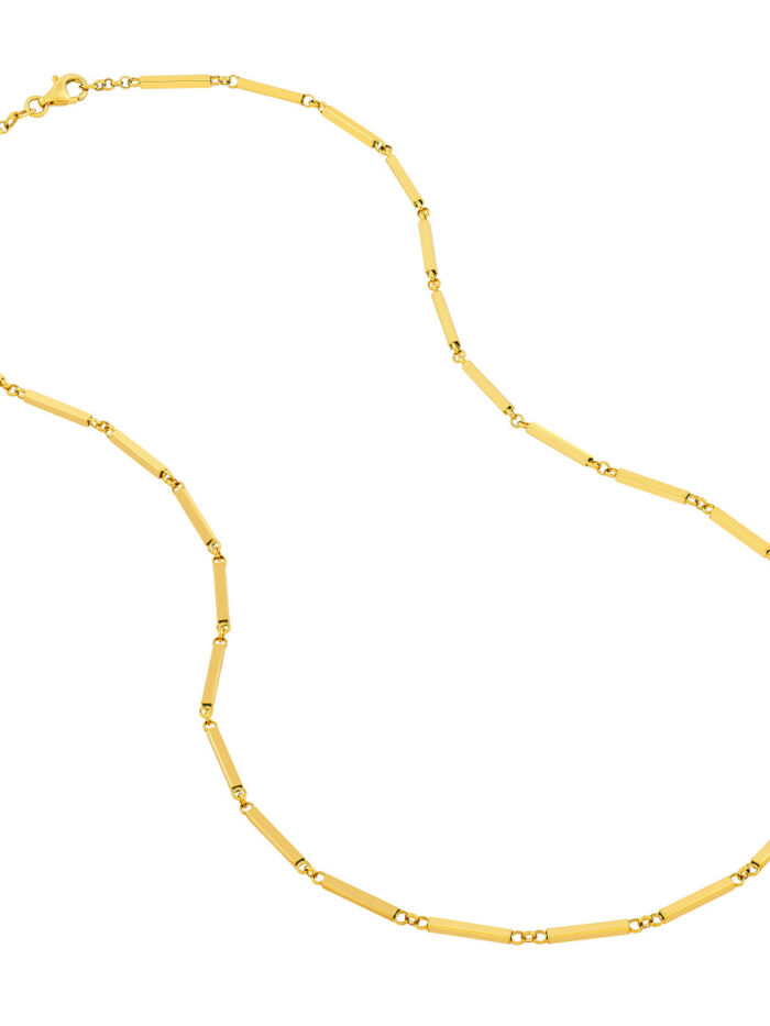 Express your individuality with this stunning 14K yellow gold bar station chain. Crafted with meticulous attention to detail, each link is uniquely linked, creating a truly one-of-a-kind piece. The 1.9mm width adds a touch of elegance, while the 18-inch length is perfect for everyday wear. Securely fastened with a pear shape lobster clasp, this chain is a timeless addition to any jewelry collection.
