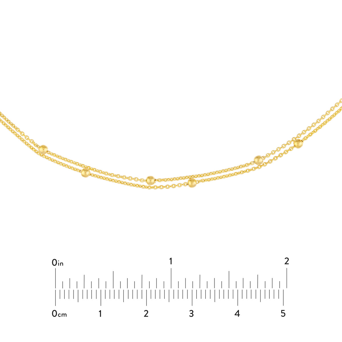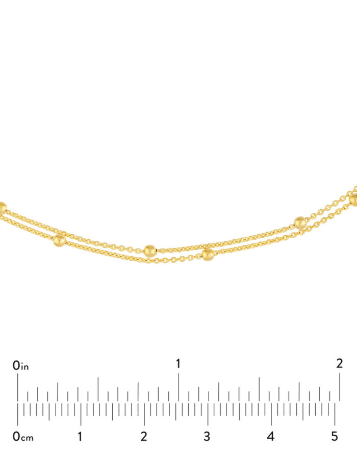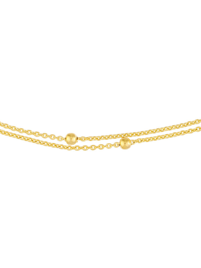 Make a statement with this versatile double chain choker. Crafted in lustrous 14K yellow gold, this piece features two delicate chains with bead stations, creating a modern and eye-catching look. The adjustable clasp allows you to customize the fit for a personalized touch.