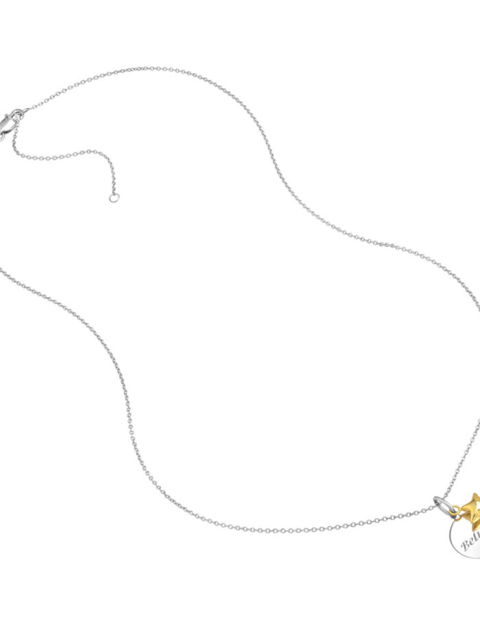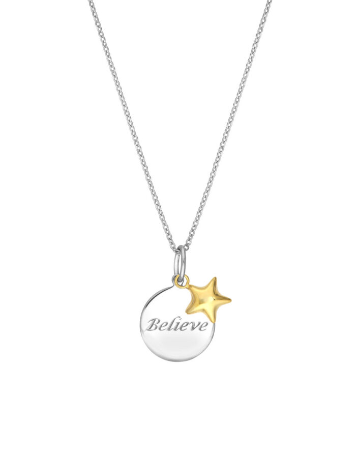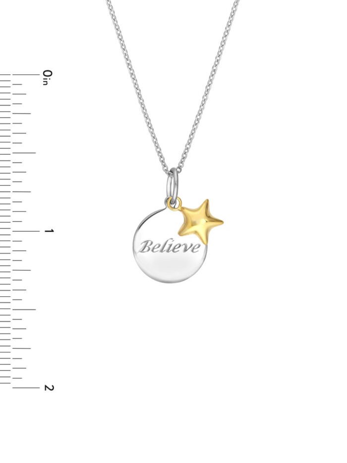 Express your faith and inspire others with this beautiful “Believe” disk necklace. Crafted from sterling silver with a delicate yellow gold plated star charm, it’s a meaningful and stylish piece. The “Believe” inscription serves as a constant reminder to stay positive and hopeful. A classic cable chain adds a touch of elegance, while the 18-inch length ensures a comfortable and flattering fit.