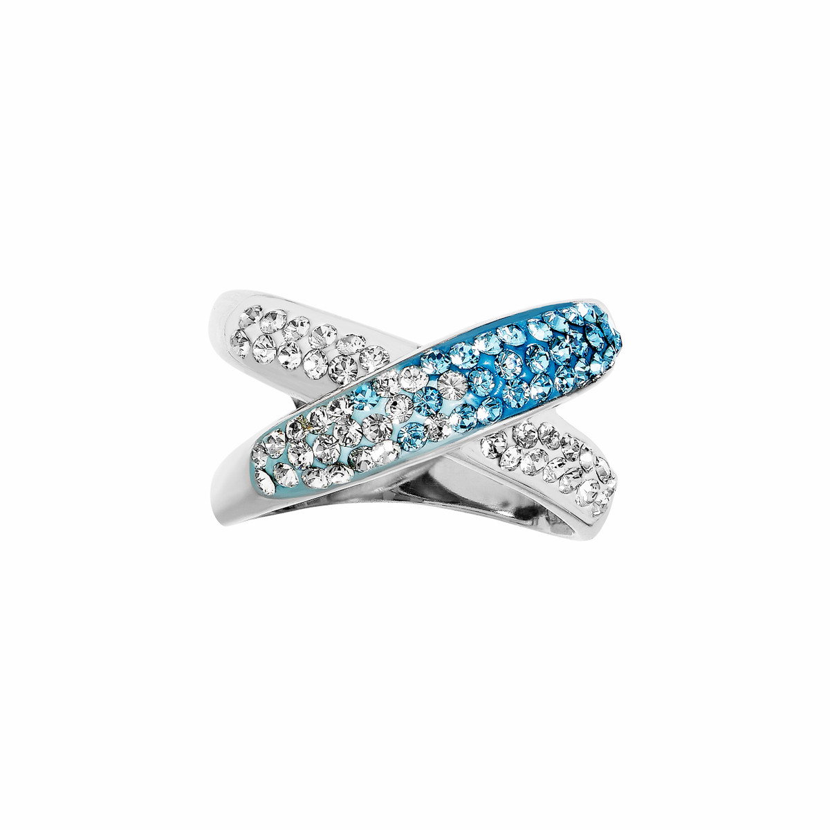 Make a statement with this chic blue and white crystal ring. Crafted from sterling silver, this ring features a unique ‘X’ design that adds a touch of modern flair. The sparkling blue and white crystals catch the light beautifully, making it a perfect choice for adding a pop of color to your look.