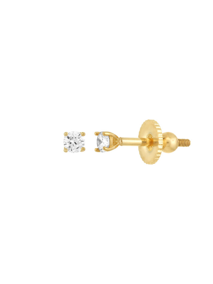 Give your little one the perfect starter pair of earrings with these charming 14K yellow gold stud earrings. Featuring a four-prong setting that securely holds sparkling CZ stones, these earrings are both stylish and durable. The screw back closure ensures a safe and comfortable fit for young ears.