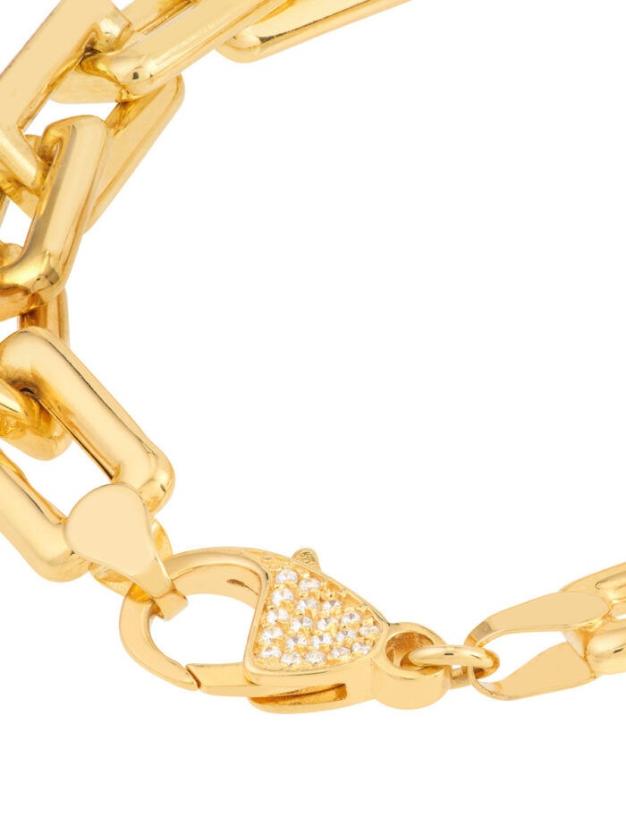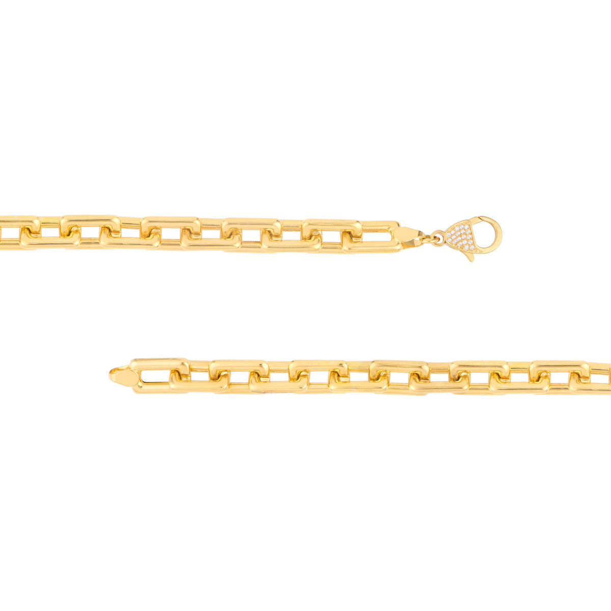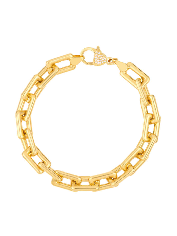 Make a bold statement with this eye-catching chunky paper clip bracelet. Crafted in 14K yellow gold, it features 8.75mm thick hollow links that create a luxurious look. The pave diamond pear lock adds a touch of sparkle and sophistication, making this bracelet a must-have for any fashion-forward individual. Embrace the chunky trend and elevate your wrist game with this stunning piece.