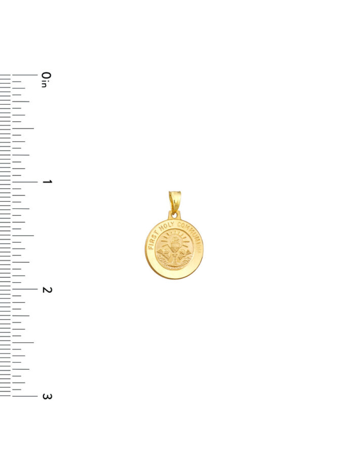 Commemorate the sacrament of communion with this beautiful Round Communion Medal pendant. Crafted from solid 14K yellow gold, this pendant features a classic round shape and a detailed representation of the communion elements. A meaningful gift for First Communion or other religious milestones, this pendant serves as a reminder of faith, grace, and spiritual nourishment.
