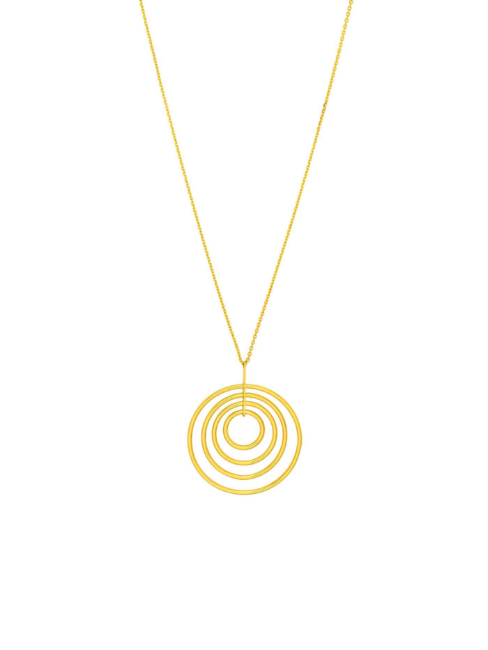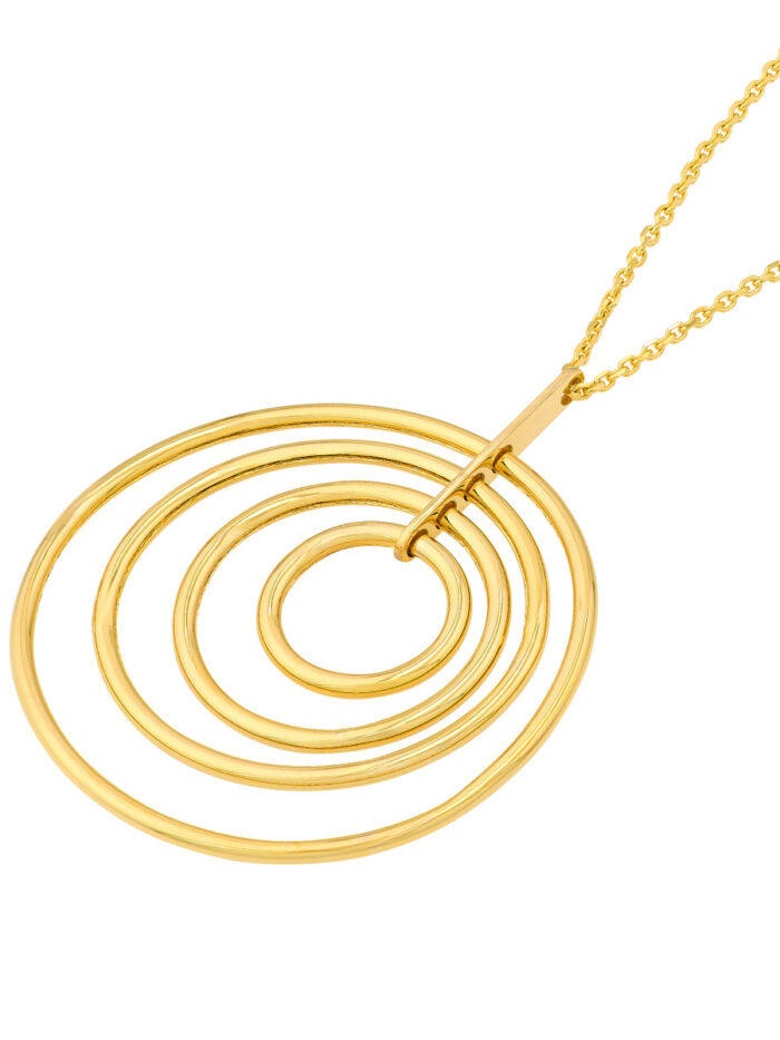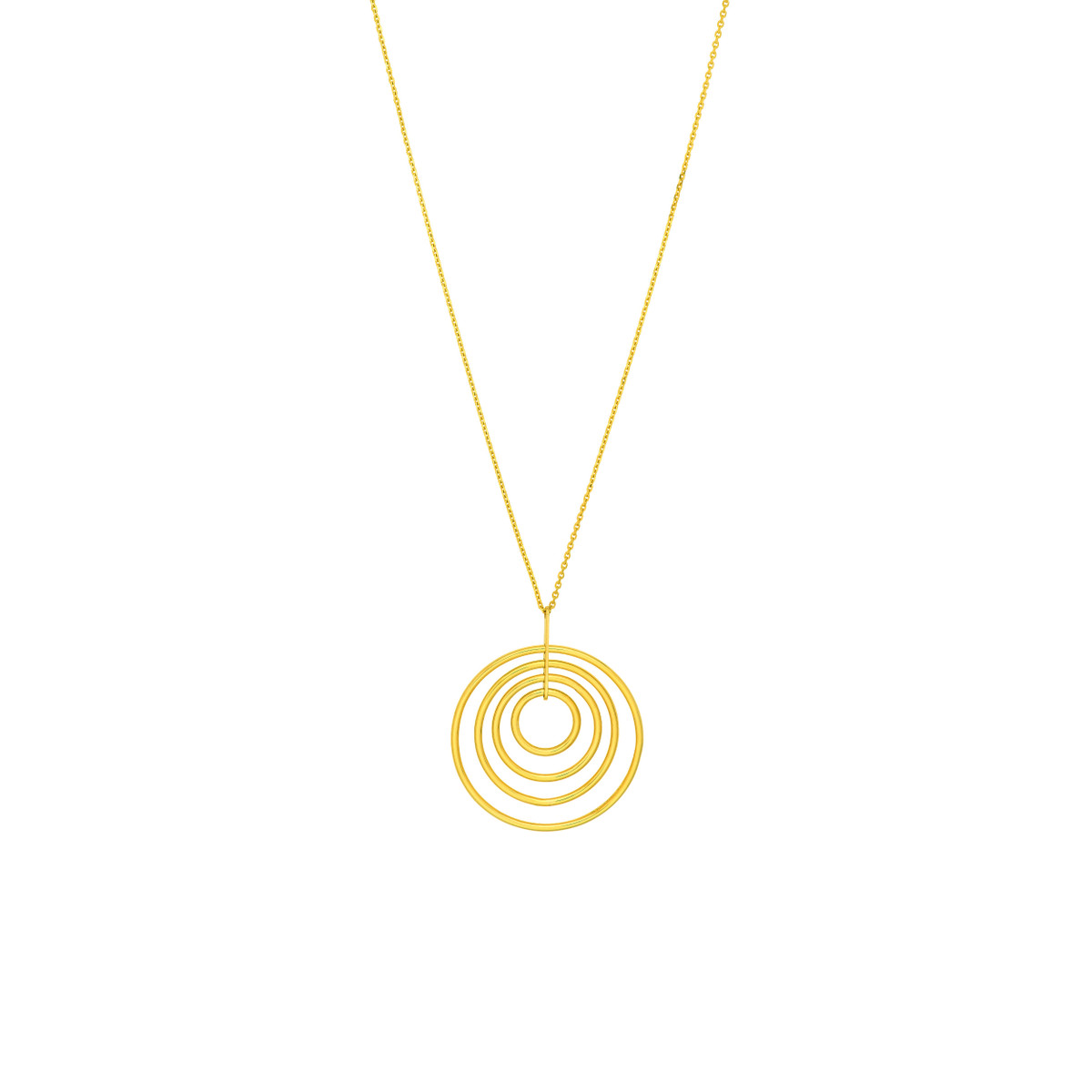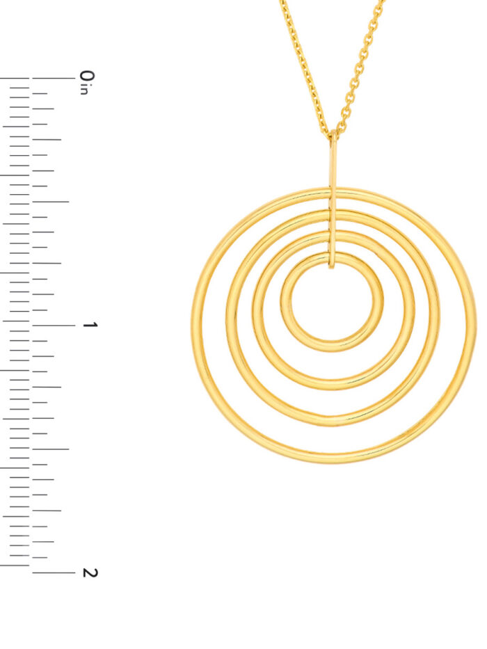 Make a statement with this unique concentric circle pendant necklace. Crafted from lustrous 14K yellow gold, the pendant features a captivating design that adds a touch of modern elegance to any look. The adjustable cable chain allows for a personalized fit, offering versatility and comfort. With a 2-inch extender, you can adjust the necklace to your desired length, making it the perfect piece for layering or wearing solo.