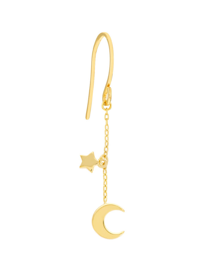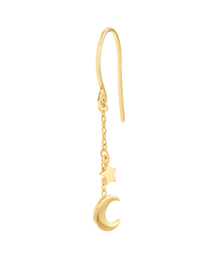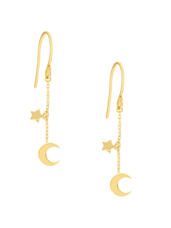Shine bright like the stars with these adorable crescent moon and star dangle earrings. Crafted from shimmering 14K yellow gold, these mini dangles feature delicate crescent moon and star motifs that add a touch of celestial magic to any look. Securely fastened with fish hook closures, these earrings are lightweight and comfortable for all-day wear.