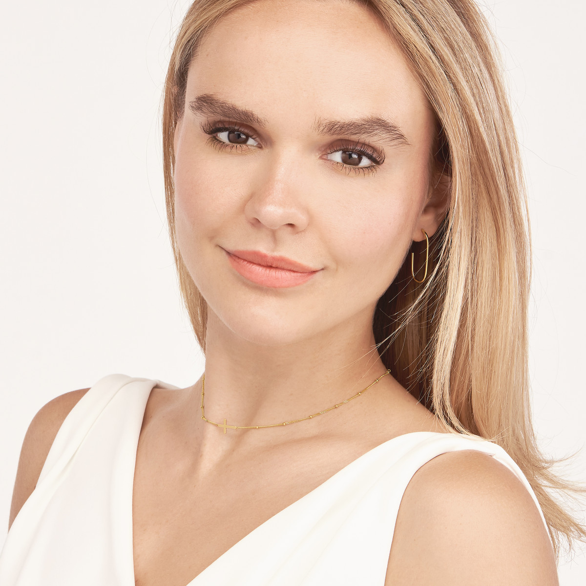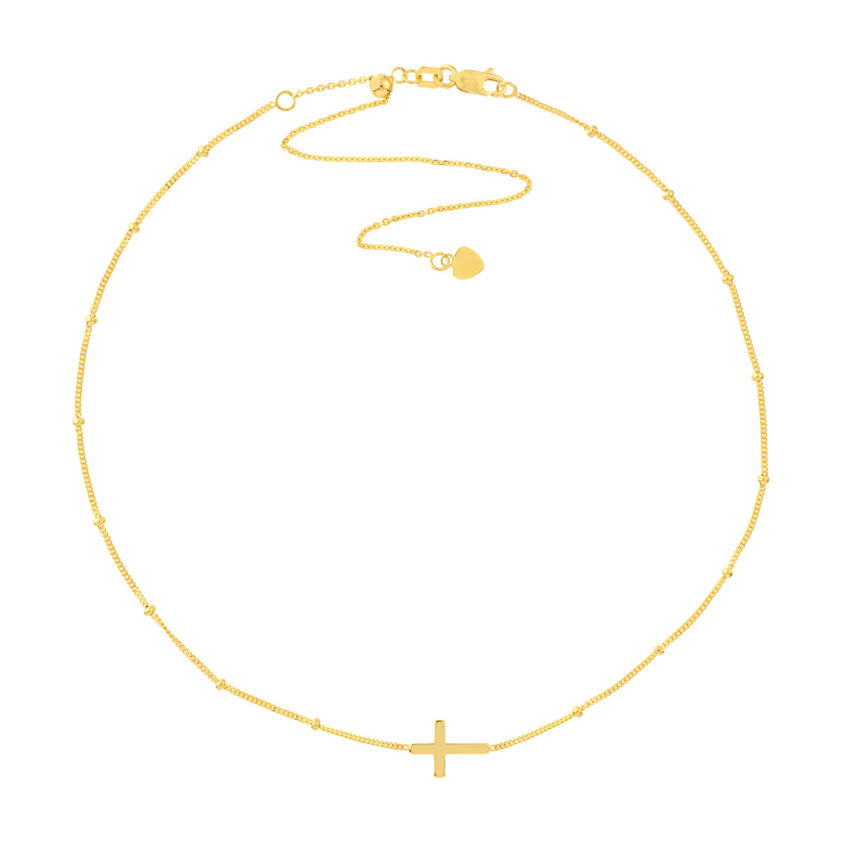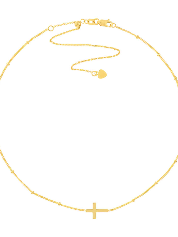 Embrace divine style with our Cross Choker Necklace on a unique Saturn Chain. This simple yet elegant piece adds a touch of sophistication to any look. Crafted from lustrous 14K yellow gold, the choker features a delicate cross pendant that symbolizes faith and timeless beauty. The adjustable design ensures a comfortable fit, while the intricate Saturn Chain adds a modern twist.