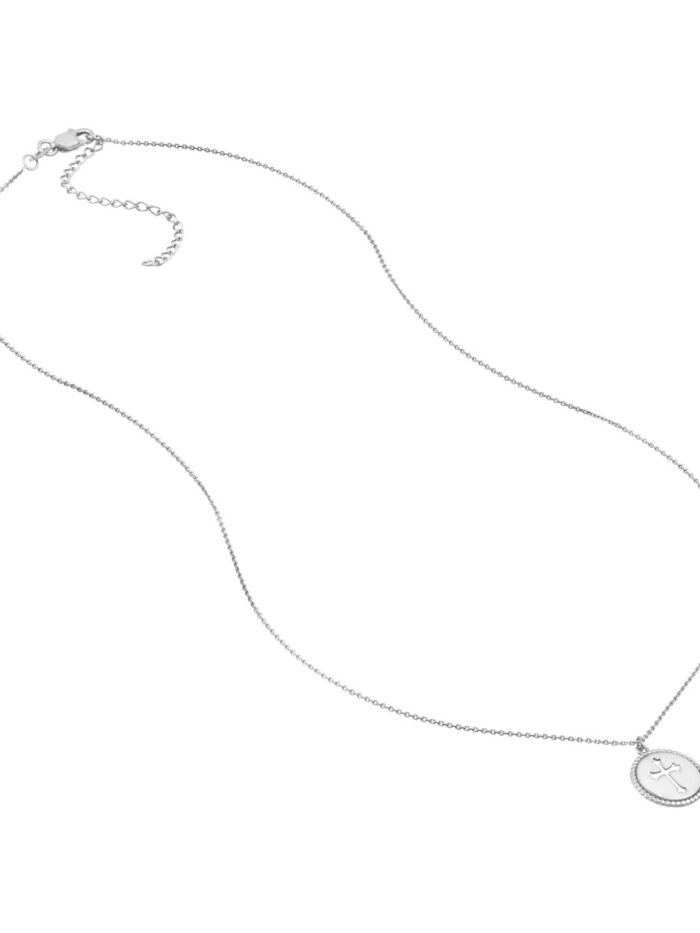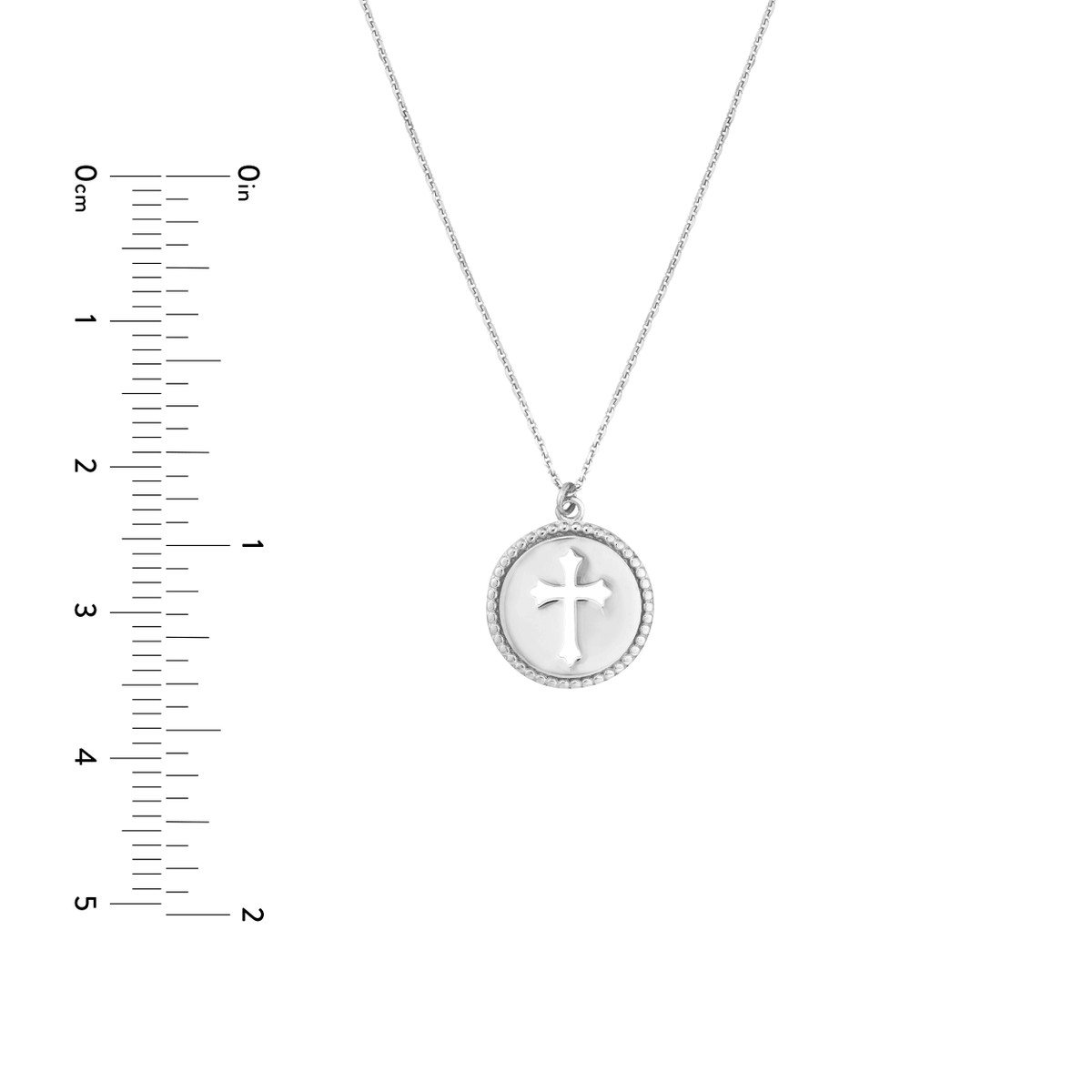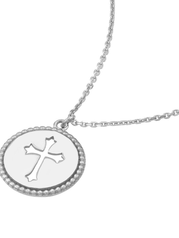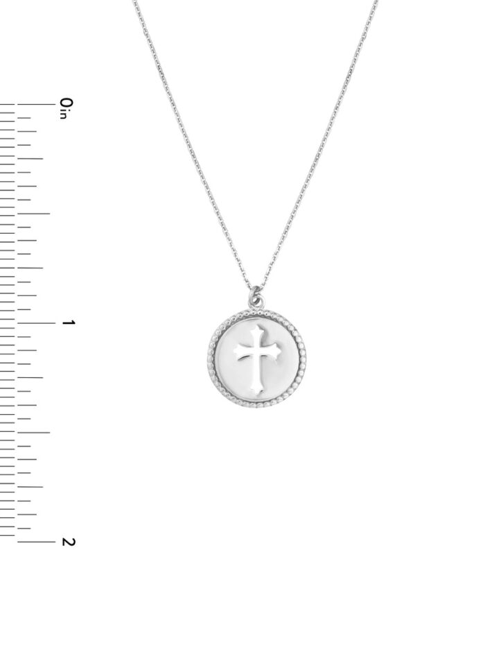 Embrace your faith with timeless elegance. This 14K white gold beaded medallion necklace features a graceful cross cutout on a 12mm disc, making a subtle yet impactful statement. The adjustable chain allows for a personalized fit, ensuring comfort and style. At 18 inches long, it gracefully complements any neckline.