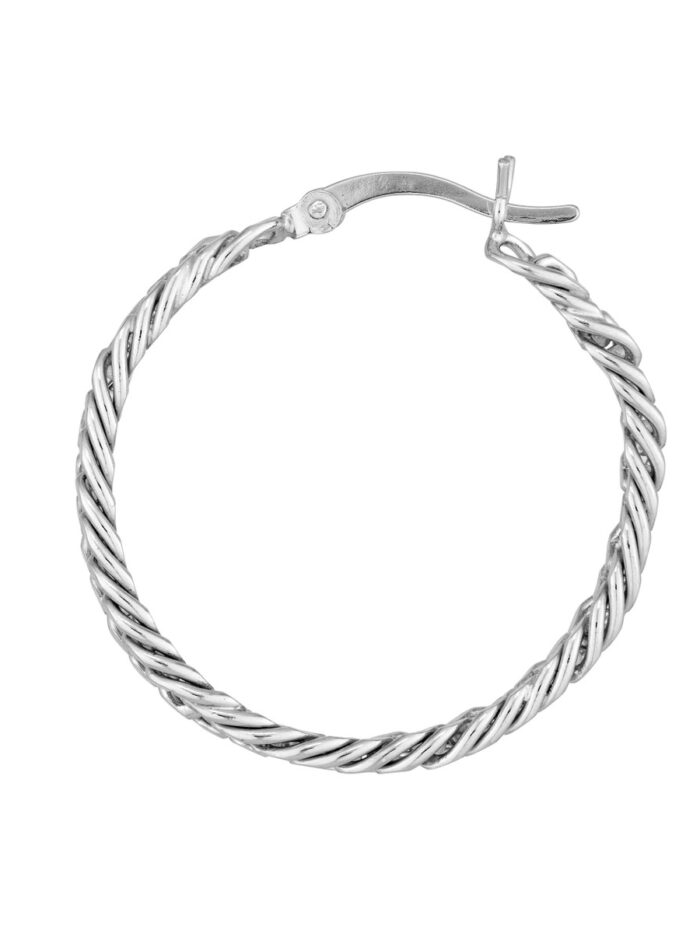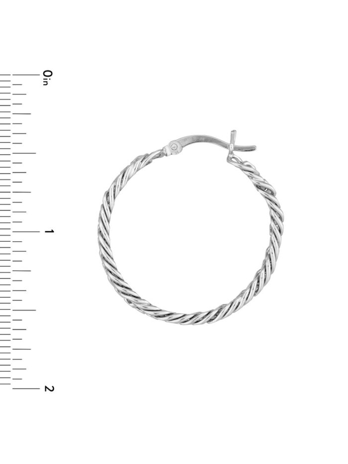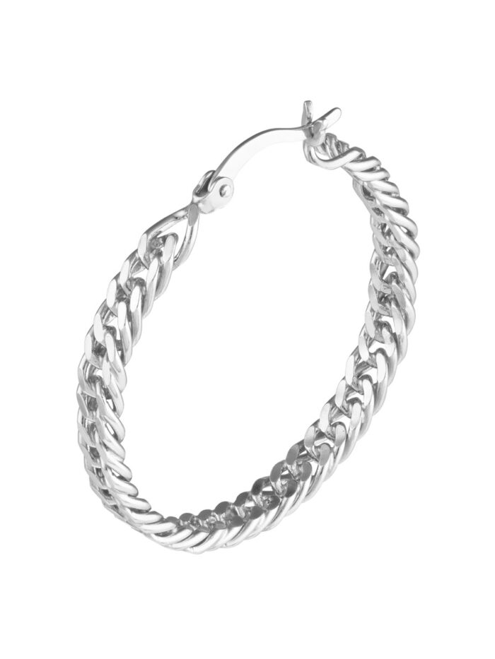 Classic curb chain detailing elevates these Sterling Silver Hoop Earrings. Plated in rhodium for a luxurious sheen and a secure hinged closure, these earrings offer a timeless and versatile look.