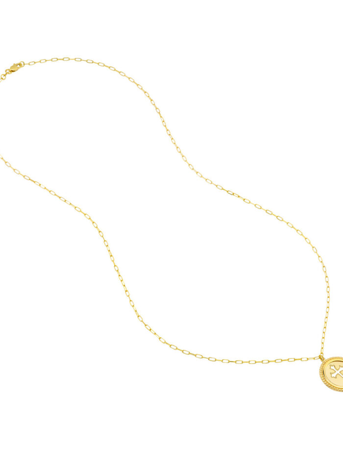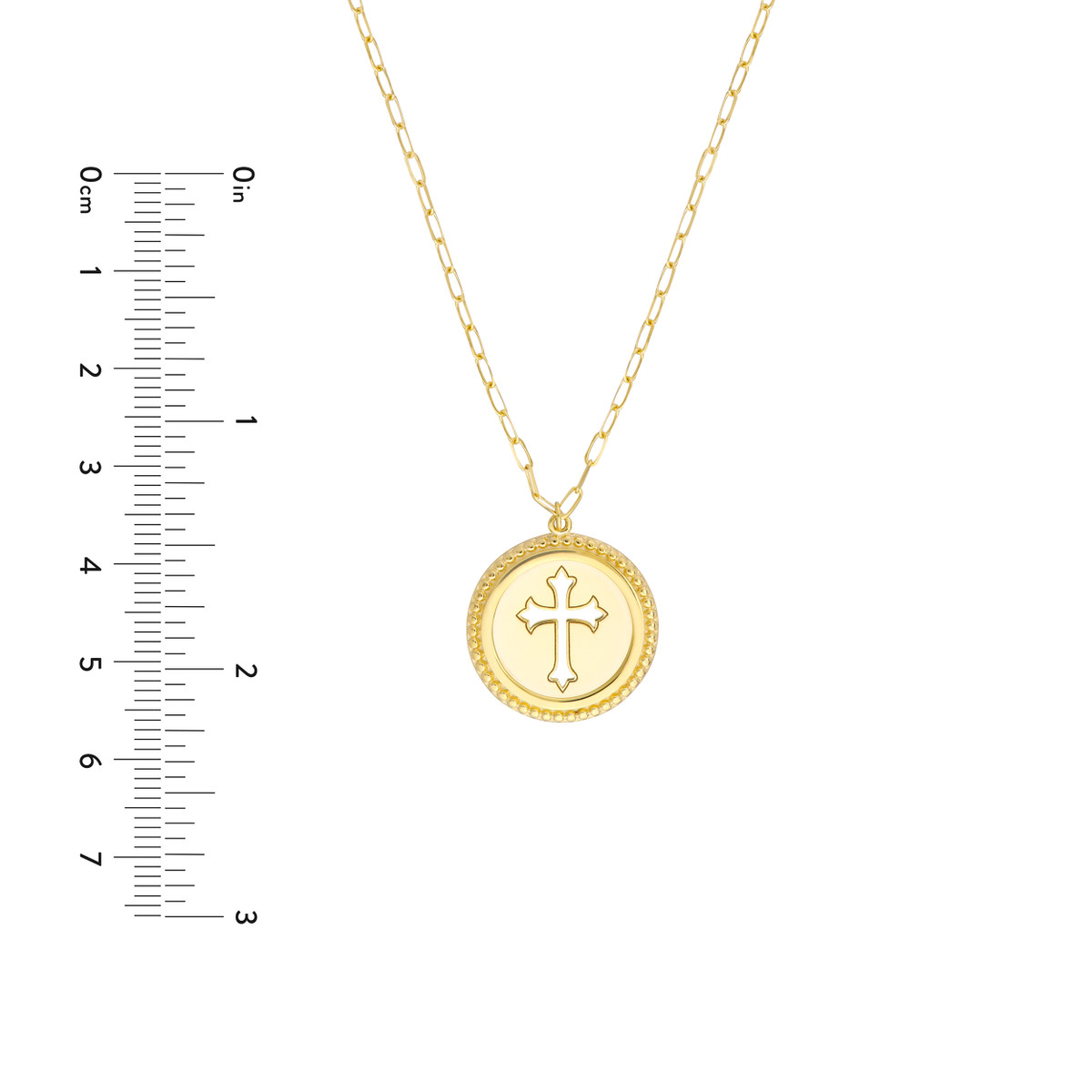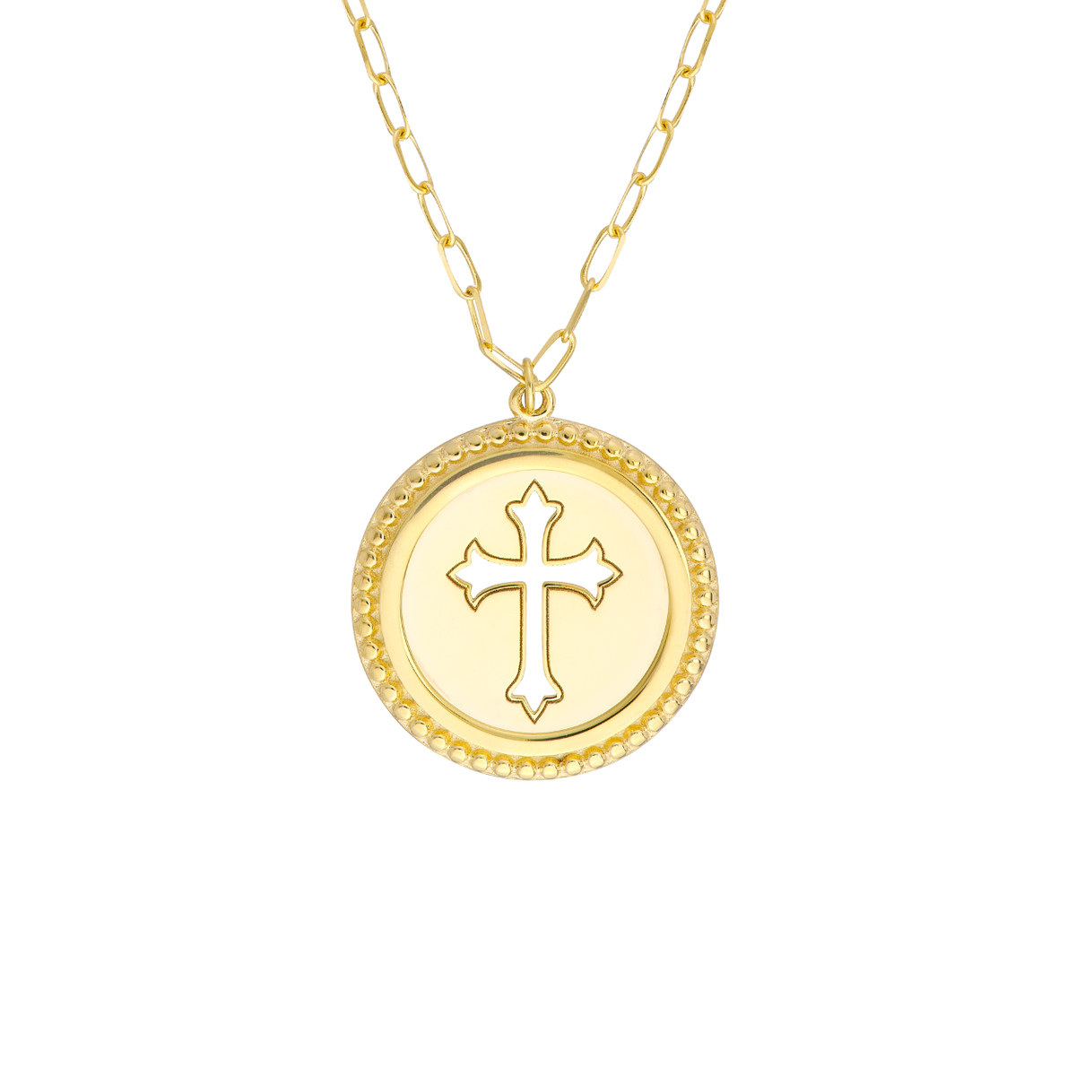 Make a statement with this unique cutout cross medallion necklace crafted in lustrous 14K yellow gold. The intricate cutout design adds a touch of modern elegance, while the bead-framed disc enhances its visual appeal. This necklace features an adjustable chain, allowing you to customize the fit for a personalized touch.