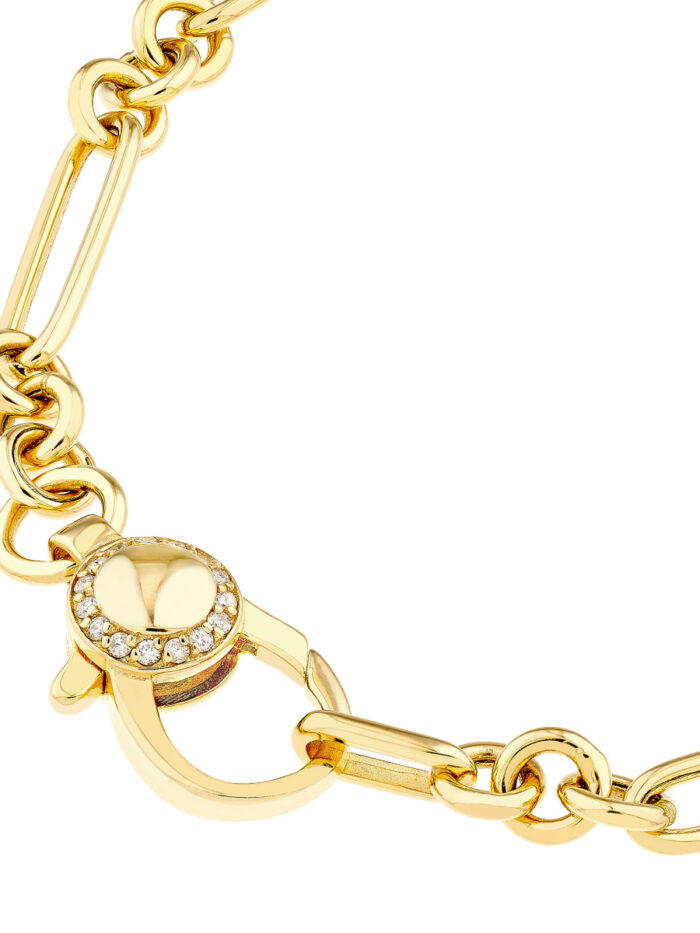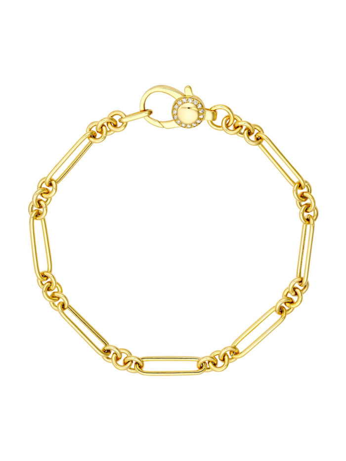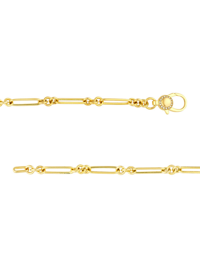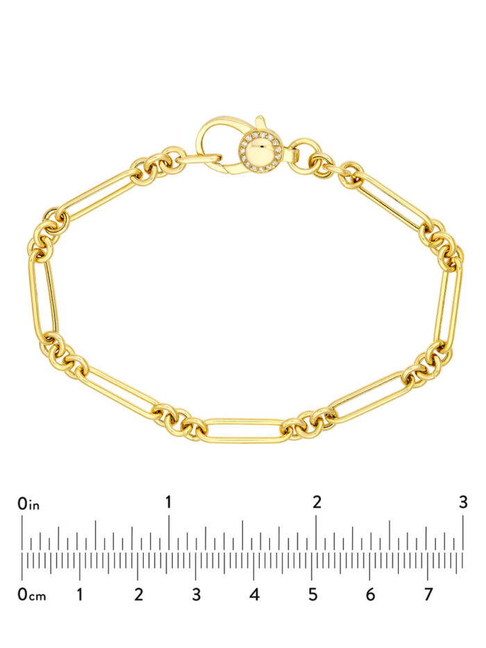 Elevate your wrist game with this stunning 14K yellow gold paper clip bracelet. The intricate paper clip chain adds a touch of modern elegance, while the sparkling diamond accented lock ensures both security and eye-catching shine. At 7.75 inches, this bracelet makes a perfect statement piece or a beautiful addition to your existing stack.