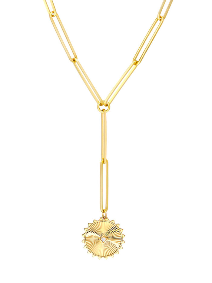 Shine bright with the Diamond Radiant Medallion Paper Clip Necklace. This modern Y-necklace features a beautiful radiant disk adorned with sparkling 3pt diamond accents. Crafted from lustrous 14K yellow gold and showcasing a delicate 5.1mm paper clip chain, this necklace is the perfect statement piece to elevate any look. Wear it solo for a touch of understated elegance, or layer it with your favorite chains for a more personalized style.