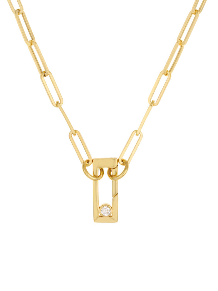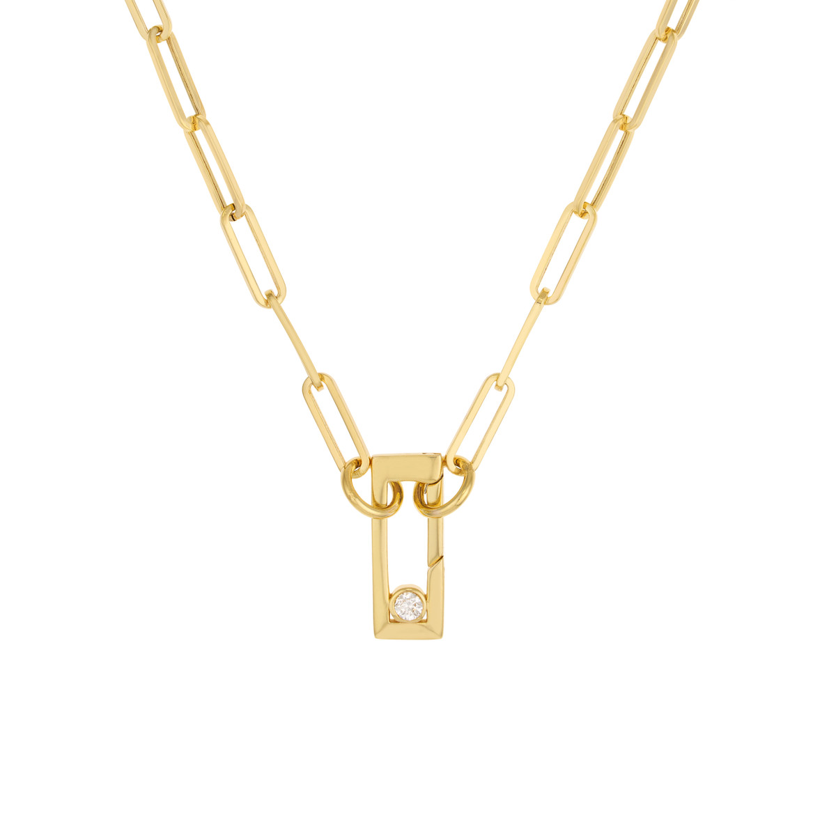 Make a statement with our Diamond Bevel Rectangular Push Lock pendant. This eye-catching piece is crafted in lustrous 14K yellow gold and features a unique rectangular design adorned with sparkling diamonds. The secure push lock closure ensures it stays in place effortlessly. Wear it solo for a bold look, or layer it with other chains for a more personalized style. Chain sold separately.