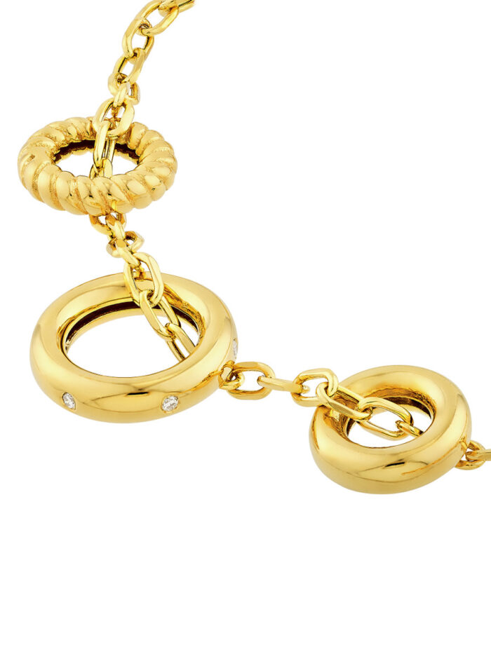 Elevate your style with the Diamond Circle Trio Necklace. This exquisite 14K yellow gold necklace features a captivating hollow Forzentina design adorned with three shimmering circle charms, each embellished with delicate 1/20tcw diamonds. The necklace gracefully drapes at 18 inches, adding a touch of timeless elegance to any outfit. Allow this radiant piece to illuminate your look and make a statement wherever you go.