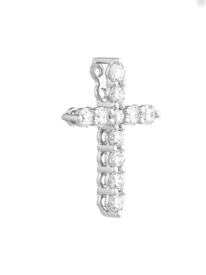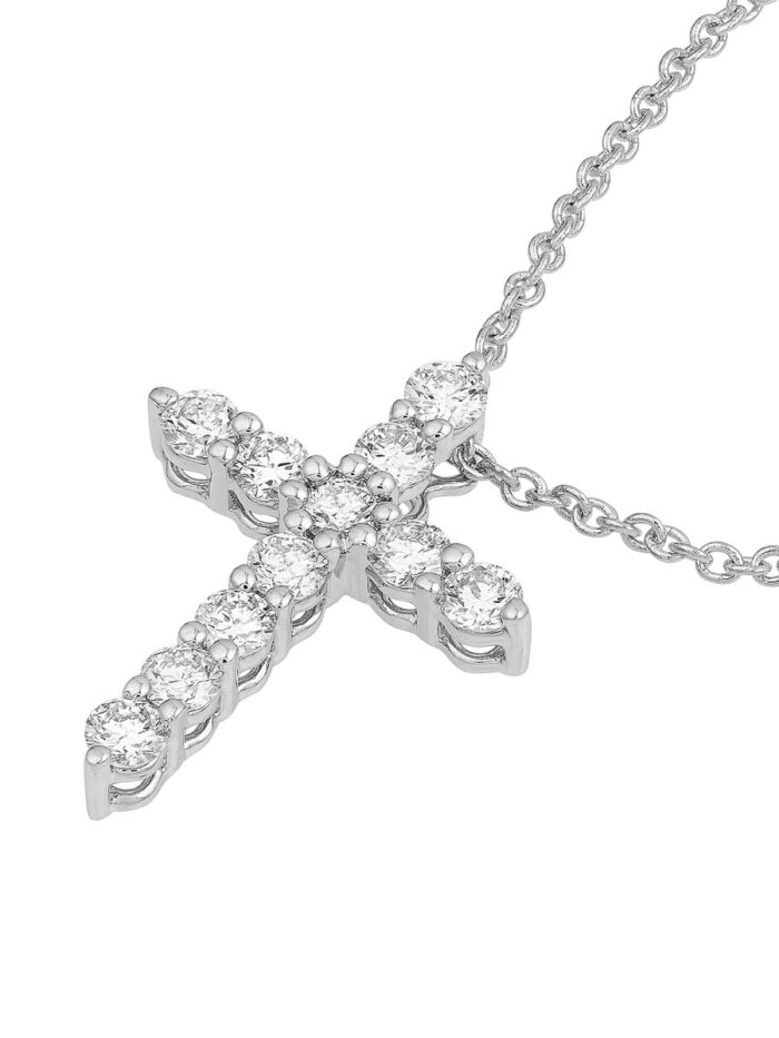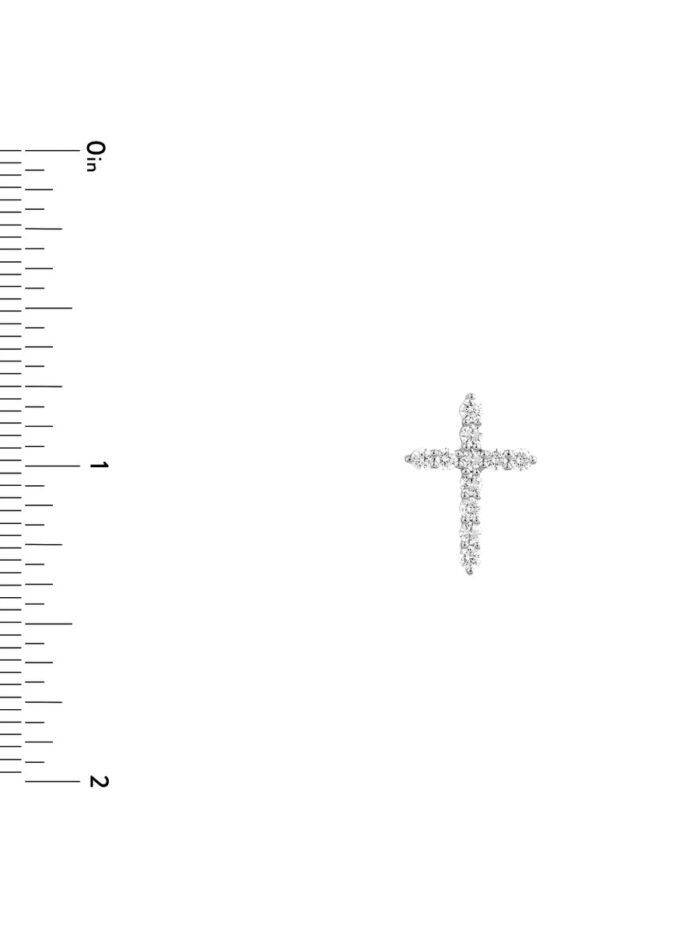 Express your faith with this exquisite diamond cross pendant. Crafted from lustrous 14K white gold, this pendant features a delicately detailed cross design adorned with sparkling 1/4 carat diamonds. Its timeless elegance makes it a perfect accent piece for any occasion, adding a touch of spirituality and sophistication to your personal style.