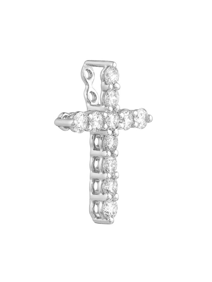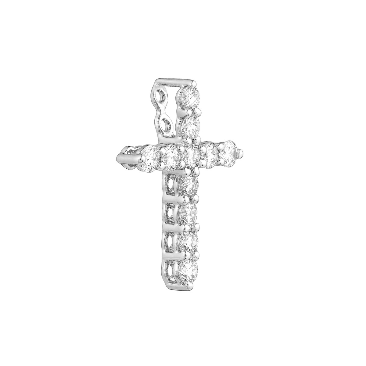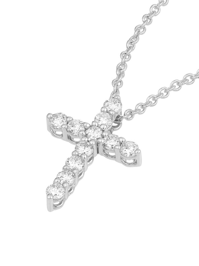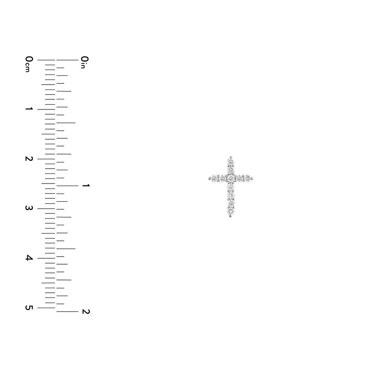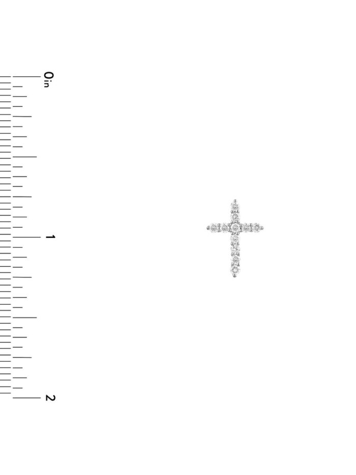 Express your faith with this exquisite diamond cross pendant. Crafted from lustrous 14K white gold, this pendant features a delicately detailed cross design adorned with sparkling 1/8 carat diamonds. Its timeless elegance makes it a perfect accent piece for any occasion, adding a touch of spirituality and sophistication to your personal style.