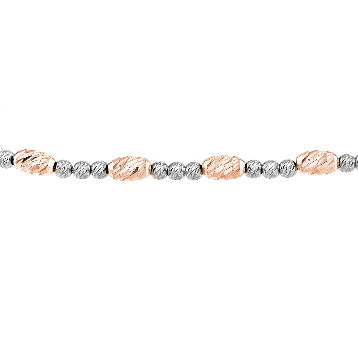 Add a touch of classic style to your wrist with this stunning diamond-cut beaded bolo bracelet. Crafted from sterling silver and plated in both white and rose gold, it features meticulously cut beads that sparkle with every twist of your wrist. The adjustable design ensures a perfect fit, while the cable chain adds a timeless touch.