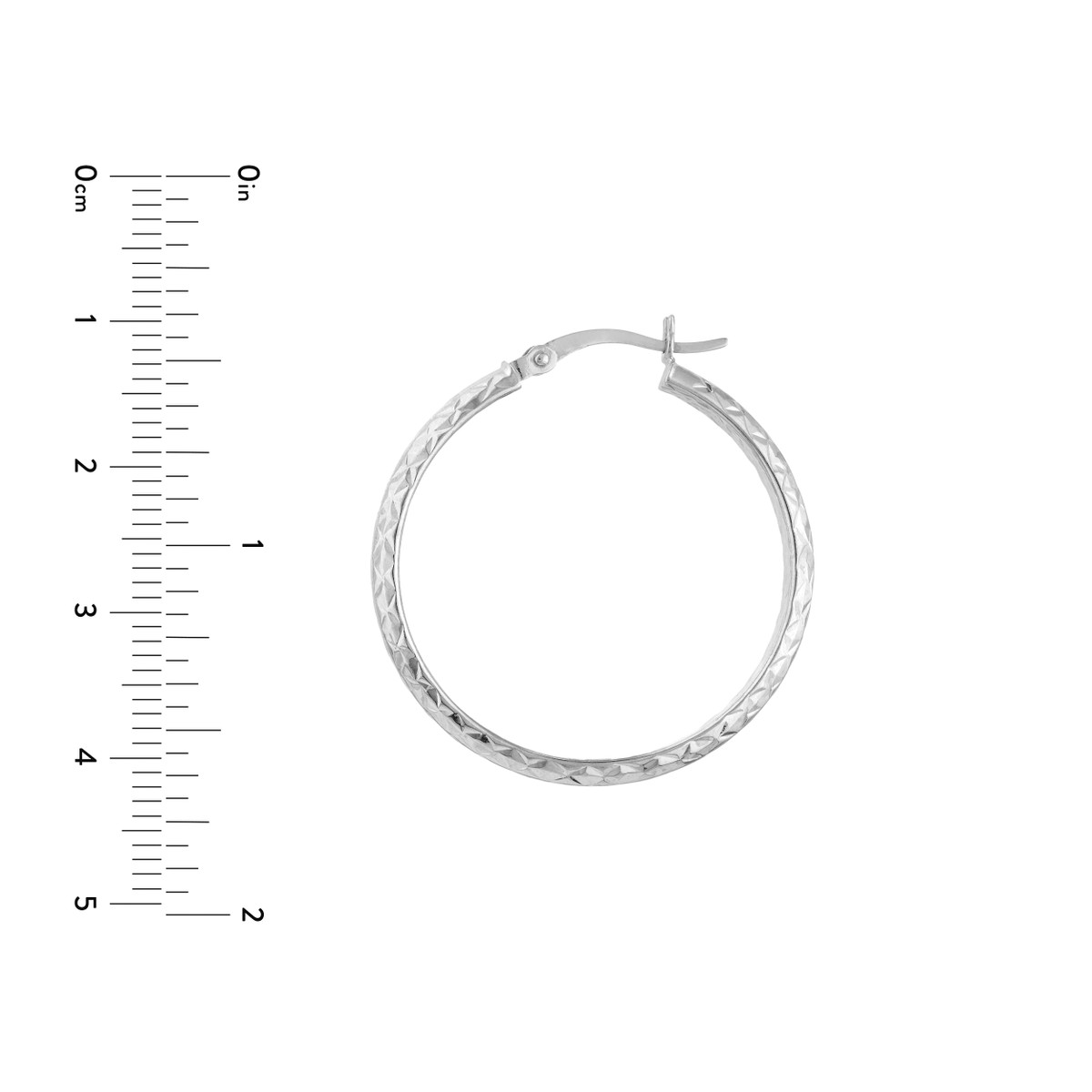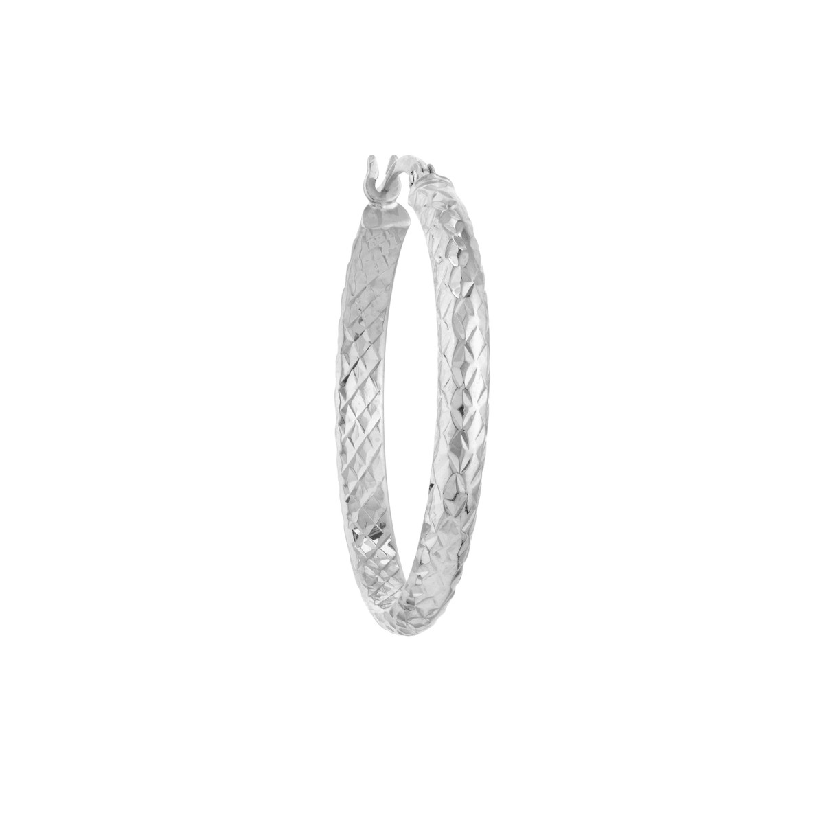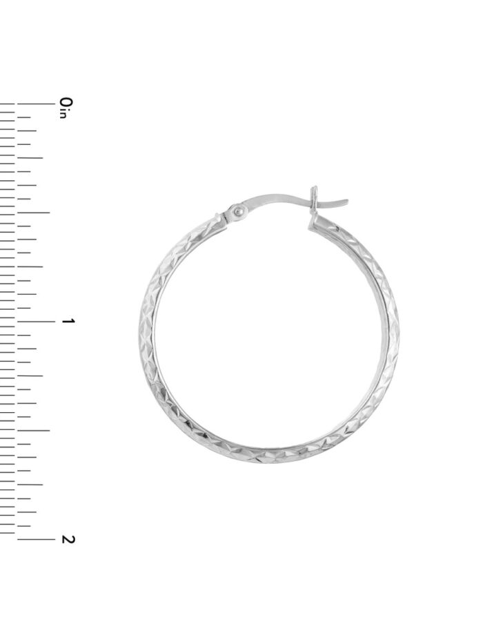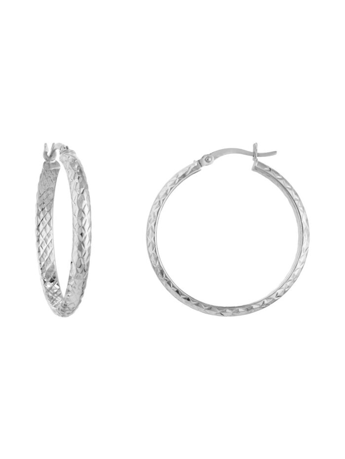 Elevate your look with these stunning 10K white gold diamond-cut hoop earrings. The intricate diamond-cut detailing adds a touch of brilliance, making them radiate with every turn. The secure hinge closure ensures comfortable wear throughout the day.