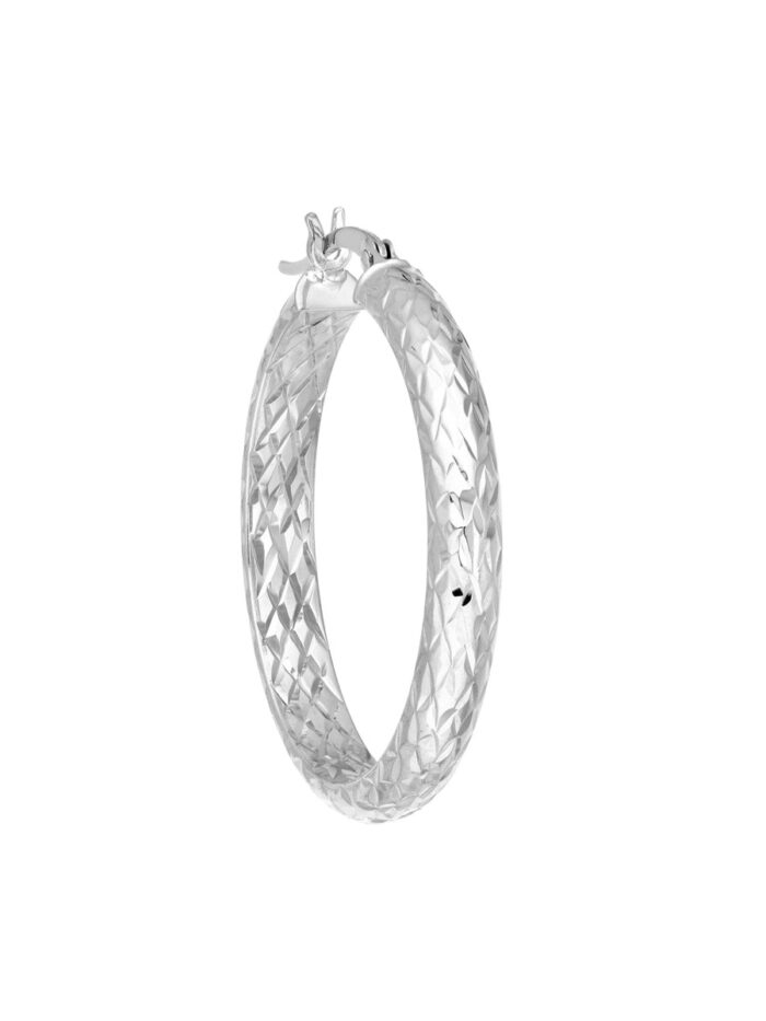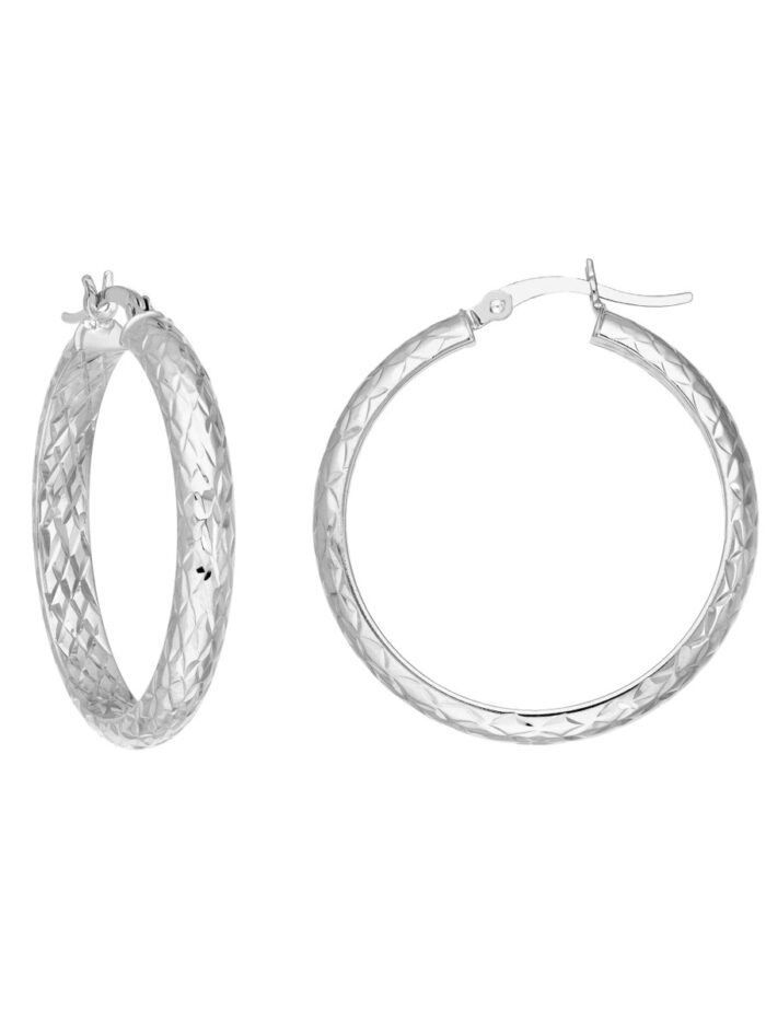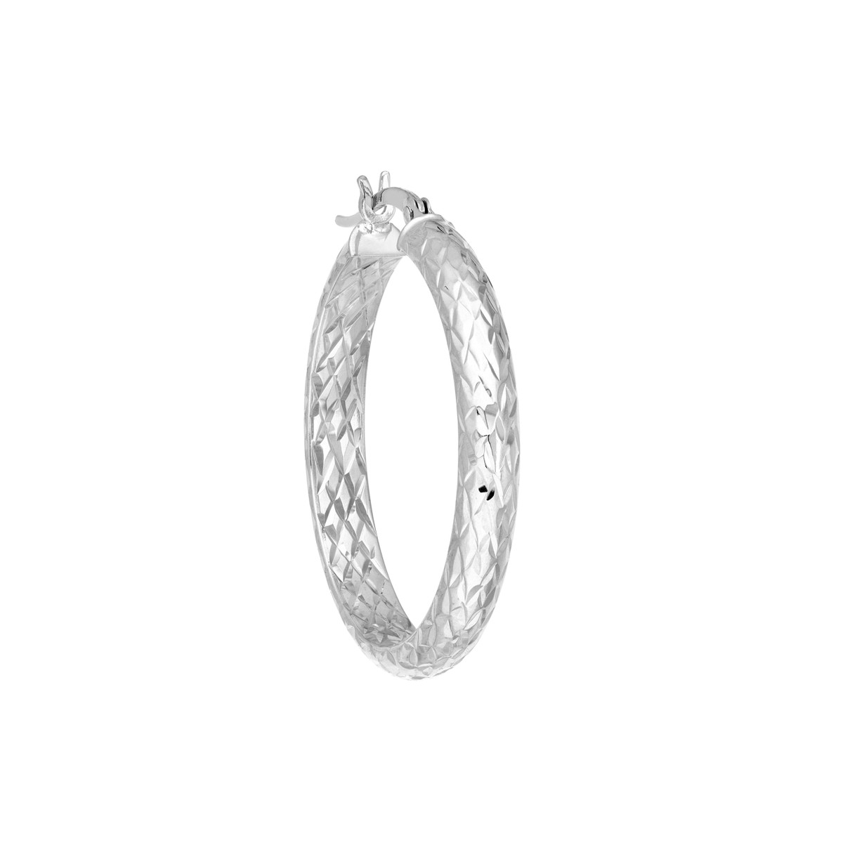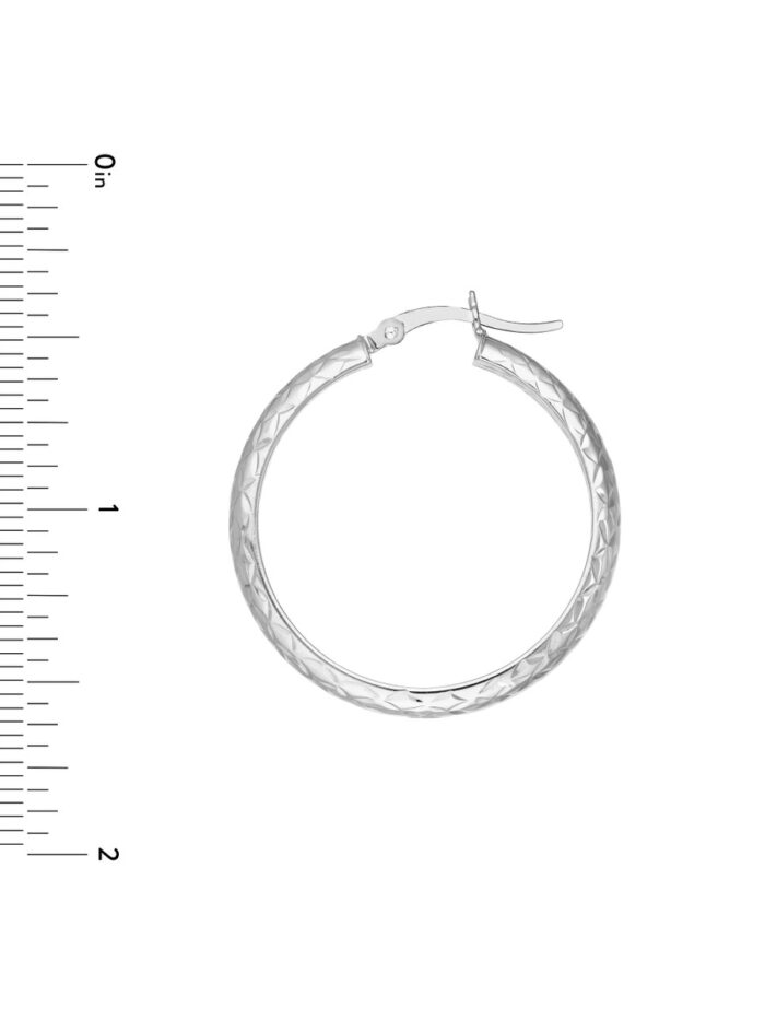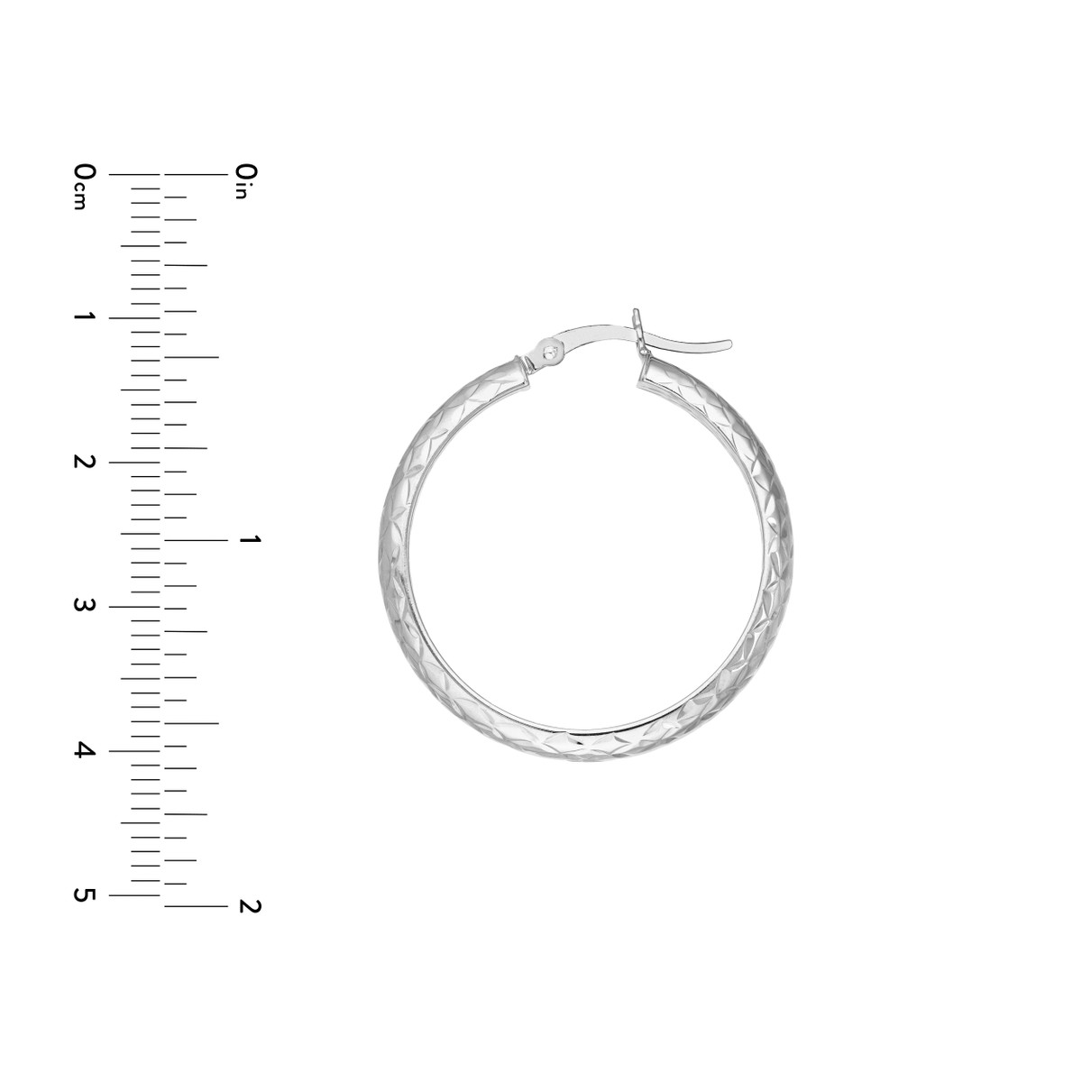 Add a touch of brilliance to your everyday style with these exquisite diamond-cut hoop earrings. Crafted from lustrous 14K white gold, these earrings feature a dazzling diamond-cut pattern on both the inner and outer surfaces, ensuring they catch the light with every move. The 30mm diameter adds a statement-making touch, perfect for elevating both casual and formal looks. Securely fastened with a hinged closure, these earrings are comfortable to wear all day long.