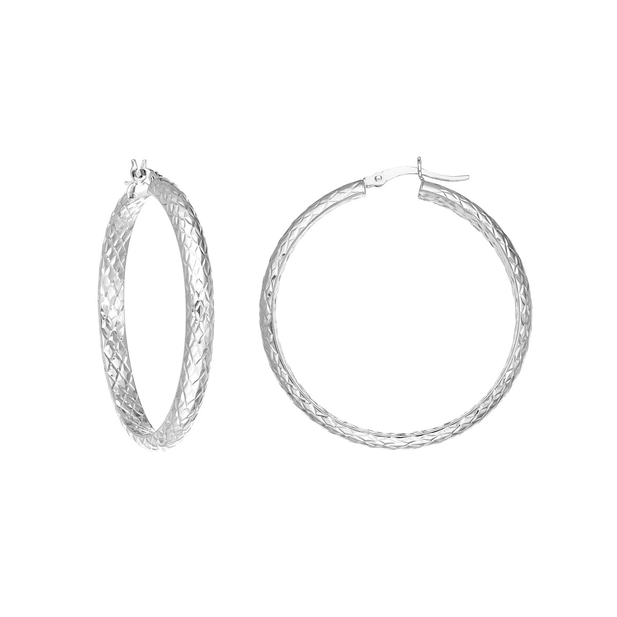 Make a statement with our 40mm x 4mm Diamond-Cut Hoop Earrings. These stunning hoops are crafted from sleek 14K white gold and feature a captivating diamond-cut design on both the inside and outside. The secure hinge closure ensures a comfortable and confident wear. These eye-catching hoops are perfect for adding a touch of glamour to any occasion.