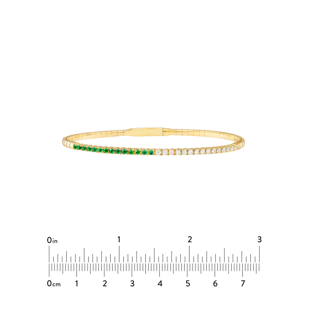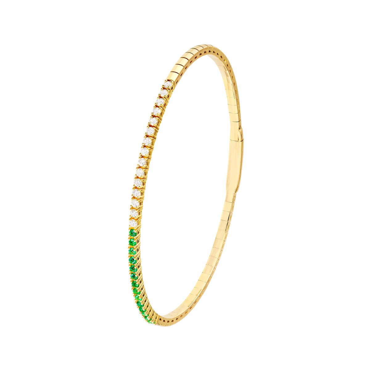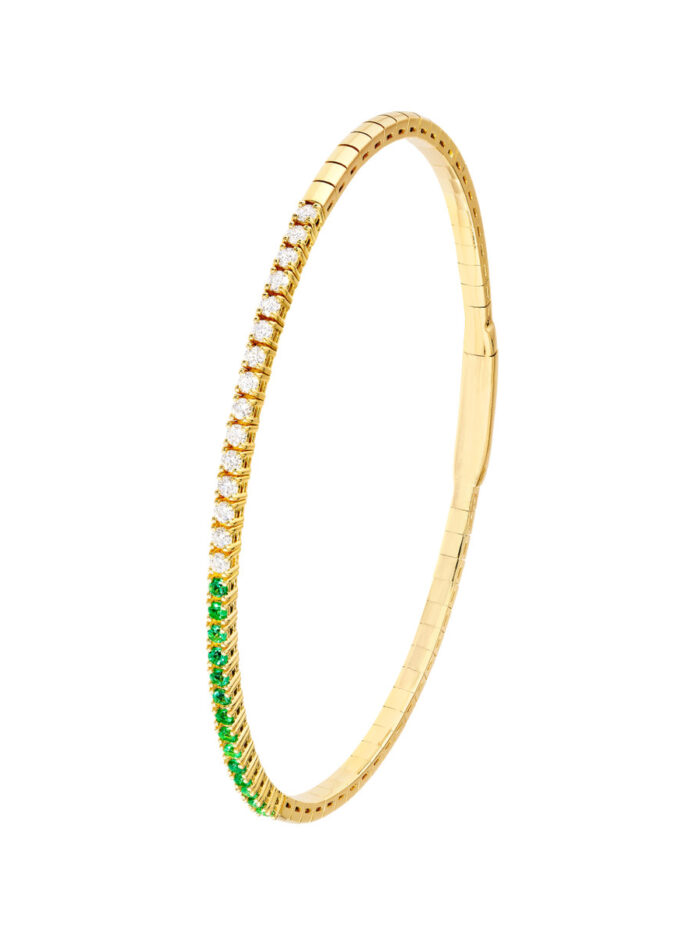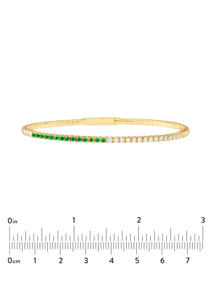 Indulge in the brilliance of this 14K Yellow Gold flexible bangle, adorned with a stunning combination of 1/3tcw diamonds and 1.8mm emeralds. The meticulously crafted design seamlessly blends elegance and color, creating a timeless piece that will elevate any outfit.
