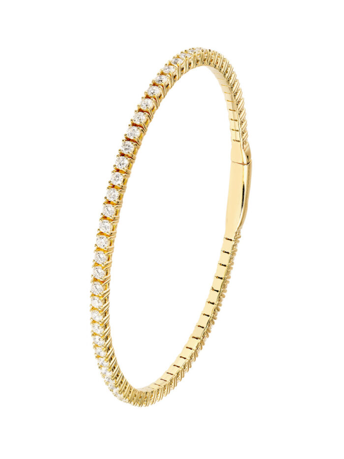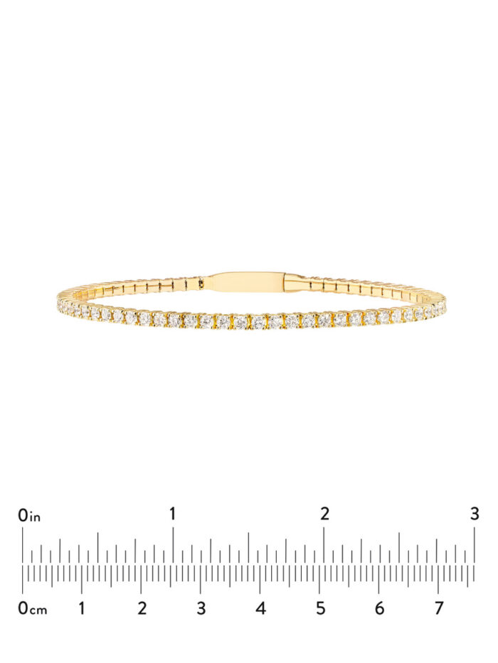 Elevate your style with the dazzling Diamond Eternity Flexi Tennis Bangle. This stunning bracelet features a continuous row of sparkling 2.2mm diamonds, expertly set in lustrous 14K yellow gold. Crafted for both comfort and elegance, the bangle secures with a secure box lock closure.