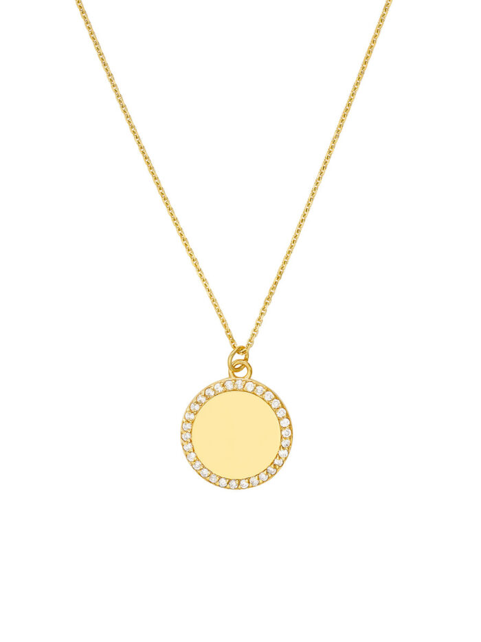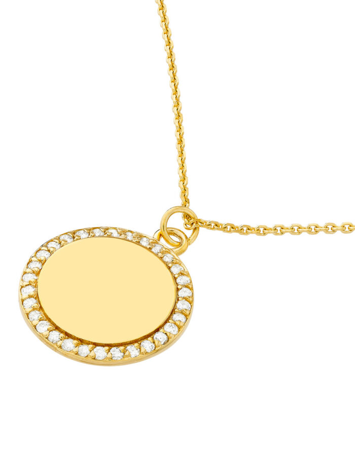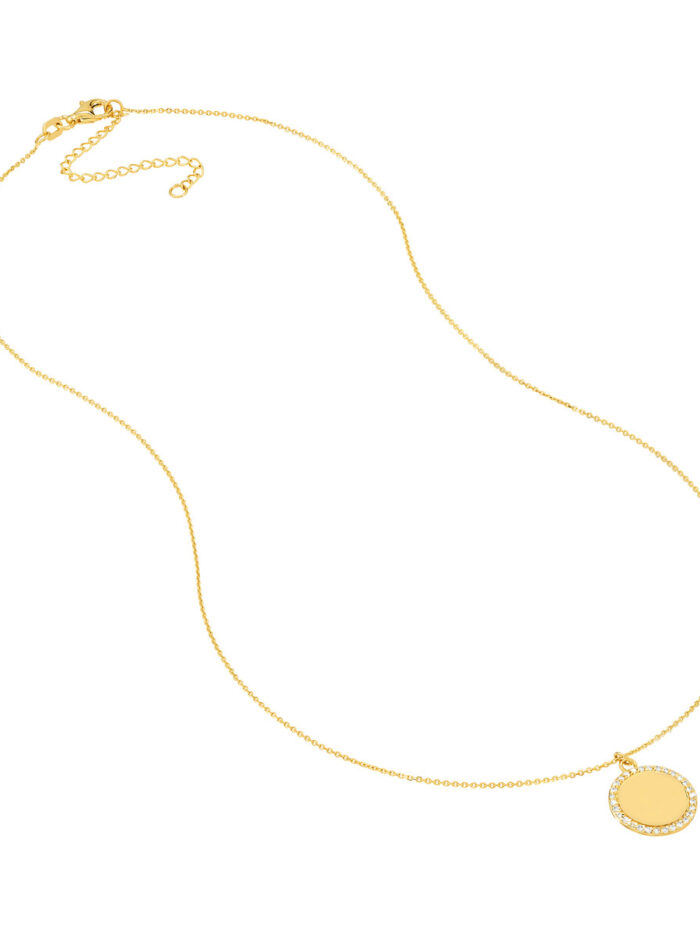 Create a personalized treasure with this beautiful diamond-framed engravable disk necklace. Crafted from lustrous 14K yellow gold, the disk pendant provides the perfect canvas for a special message or date. The adjustable length allows for a customized fit, and the secure pear shape lobster clasp ensures it stays in place.