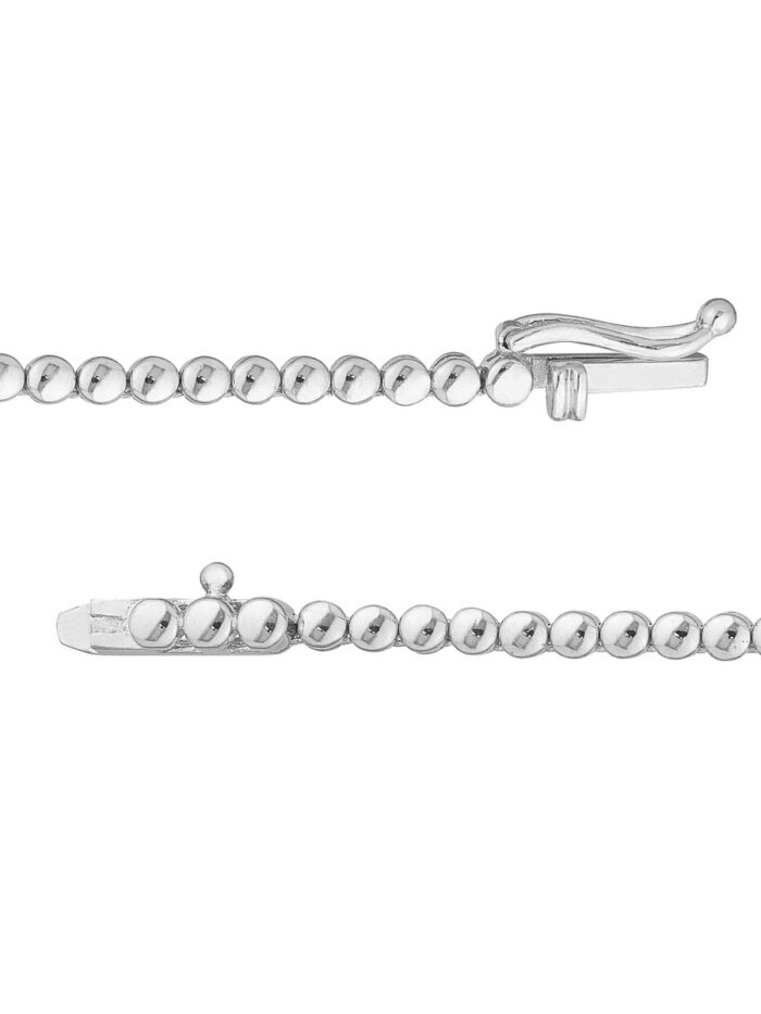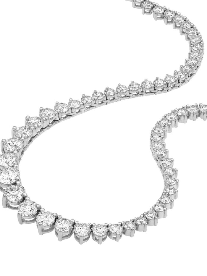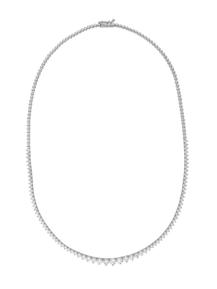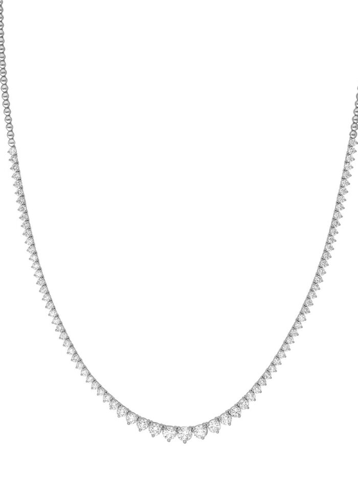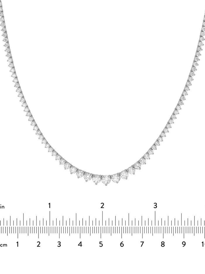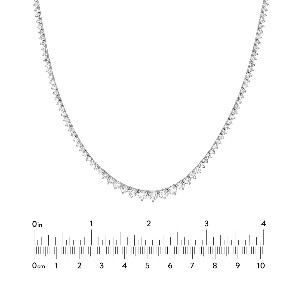 Our Diamond Graduated Tennis Necklace in 14K white gold embodies timeless elegance. Featuring a stunning 5-1/4 carats of sparkling diamonds set halfway around the lustrous chain, this necklace makes a captivating statement. The secure box clasp ensures comfortable wear, making it perfect for everyday elegance or special occasions.