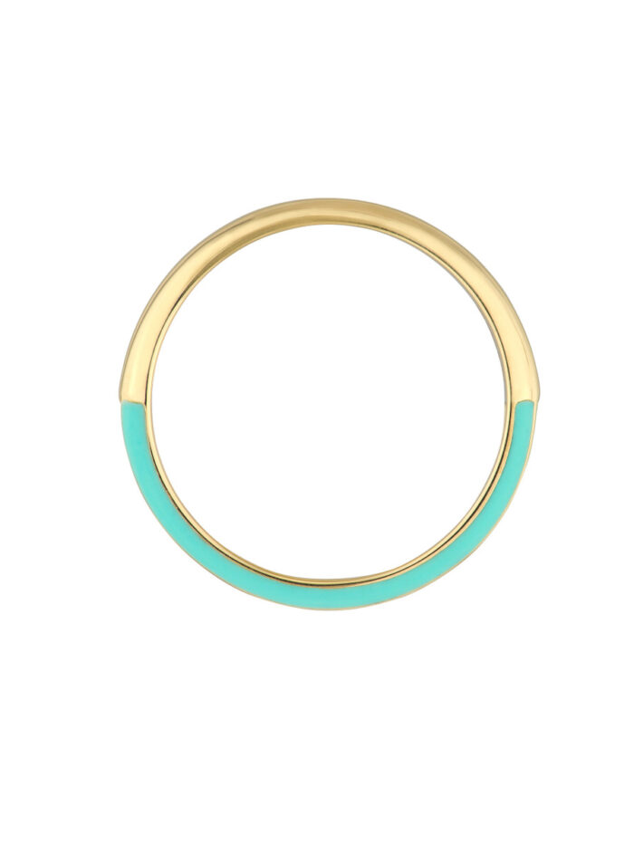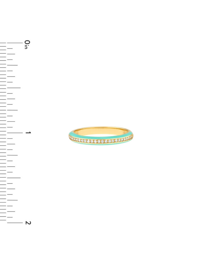 Shine bright with the Diamond Band with Light Turquoise Enamel. This stunning band combines the timeless elegance of 14K yellow gold with a pop of color from the light turquoise enamel. The delicate diamond accents add a touch of sparkle, making this band perfect for stacking or wearing as a standalone statement piece. This is a beautiful way to celebrate your love or add a unique touch to your personal style.