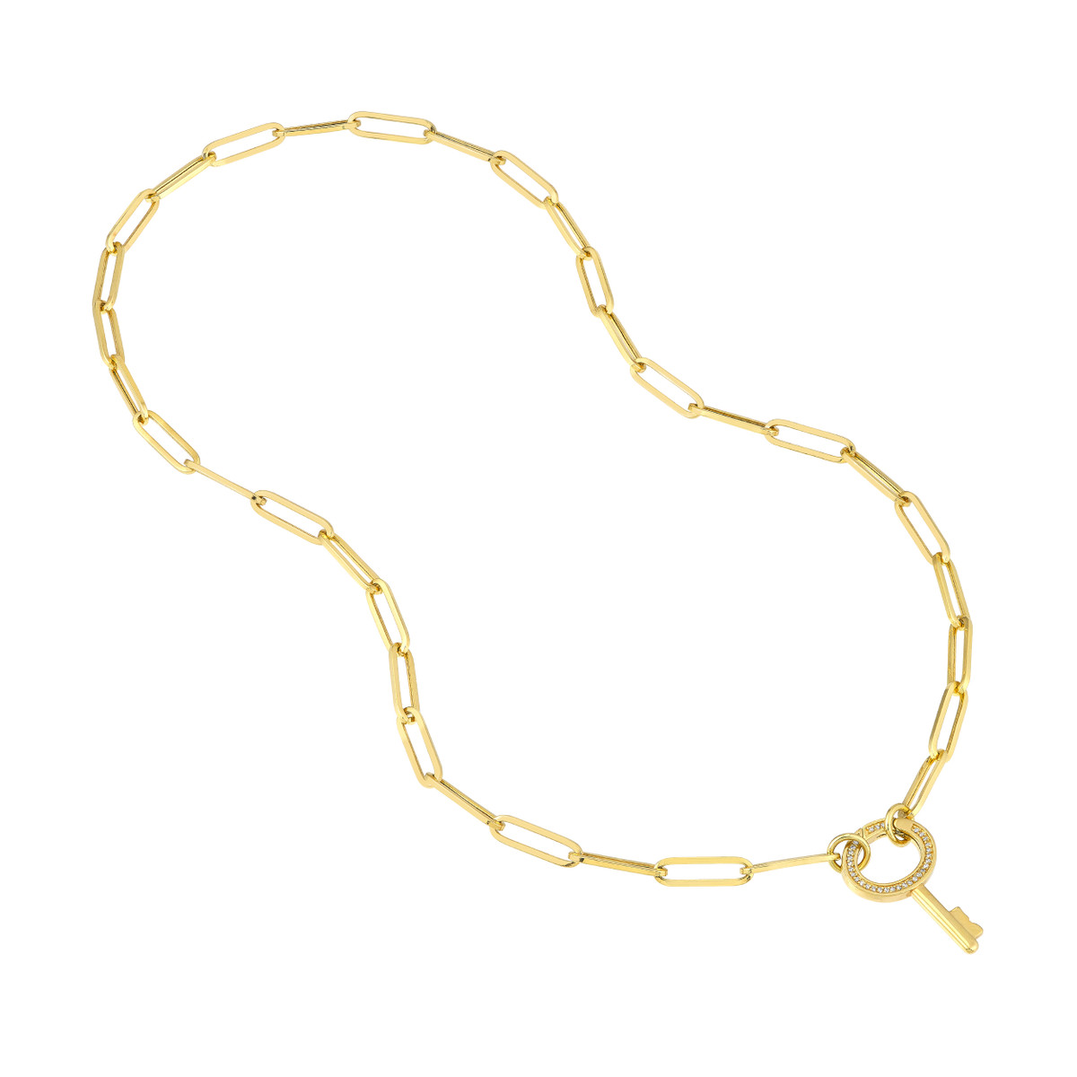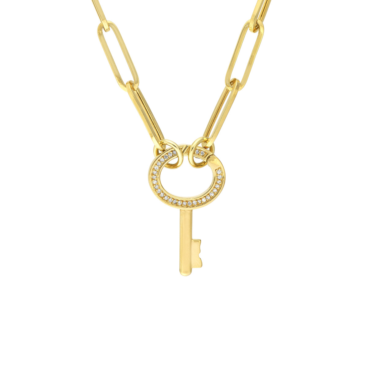 Make a dazzling statement with the Diamond Oval Key Push Lock pendant. Crafted from 14K yellow gold, this exquisite piece features a stunning oval diamond design, accented with a sparkling 1/6ctw diamond. The secure push lock closure adds an element of sophistication.