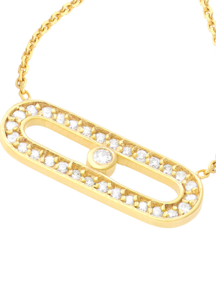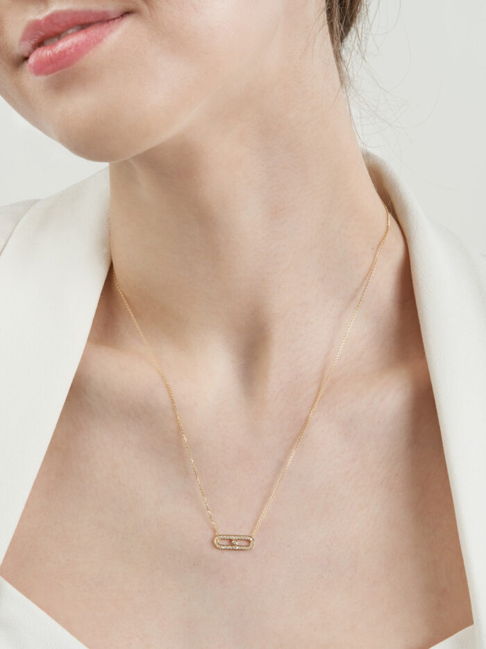 A touch of modern elegance, this dainty necklace features a horizontal, paperclip link adorned with a sparkling 1/8ctw diamond. Crafted in lustrous 14K yellow gold, the paperclip link rests gracefully on a secure D/C baby curb chain. This versatile necklace adds a subtle yet eye-catching touch to any ensemble.