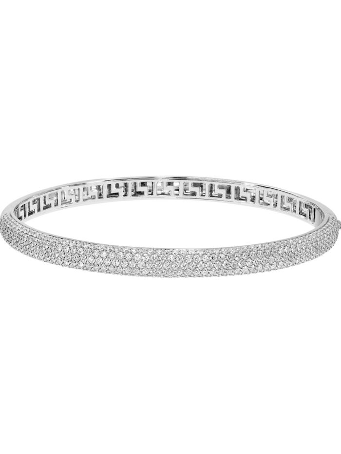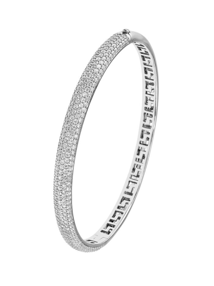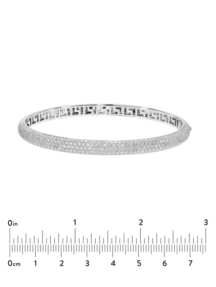 Embrace understated elegance with this exquisite 3 carat total weight diamond pave bangle. Five rows of shimmering pave diamonds create a breathtaking display of brilliance, while the sleek 14K white gold setting adds a touch of modern sophistication. The sturdy curb chain ensures a secure and comfortable fit, making this bangle a perfect everyday accessory.