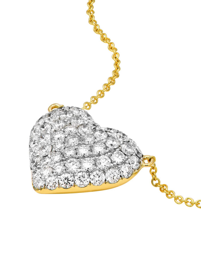 Express your love with this enchanting 1-1/3tcw Diamond Pave Heart necklace. The heart-shaped pendant, carefully set with brilliant diamonds in 14K white gold, is suspended from a delicate 14K yellow gold cable chain. This timeless design effortlessly blends elegance and sentimentality, making it the perfect gift for yourself or a loved one. The 18-inch chain provides a comfortable and flattering length, suitable for both casual and formal occasions.