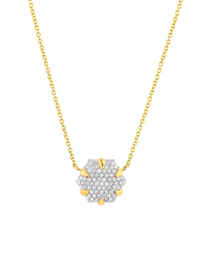 Adorn your neckline with the sparkling sentiment of this 3/8tcw Diamond Pave Hexagon pendant. Crafted in luxurious 14K yellow and white gold, this elegant design features a timeless hexagon shape adorned with brilliant diamonds. Its secure pear-shaped lobster clasp ensures effortless wear, making it the perfect piece for everyday elegance or special occasions. The 18-inch cable chain gracefully complements the pendant, adding a touch of classic sophistication.