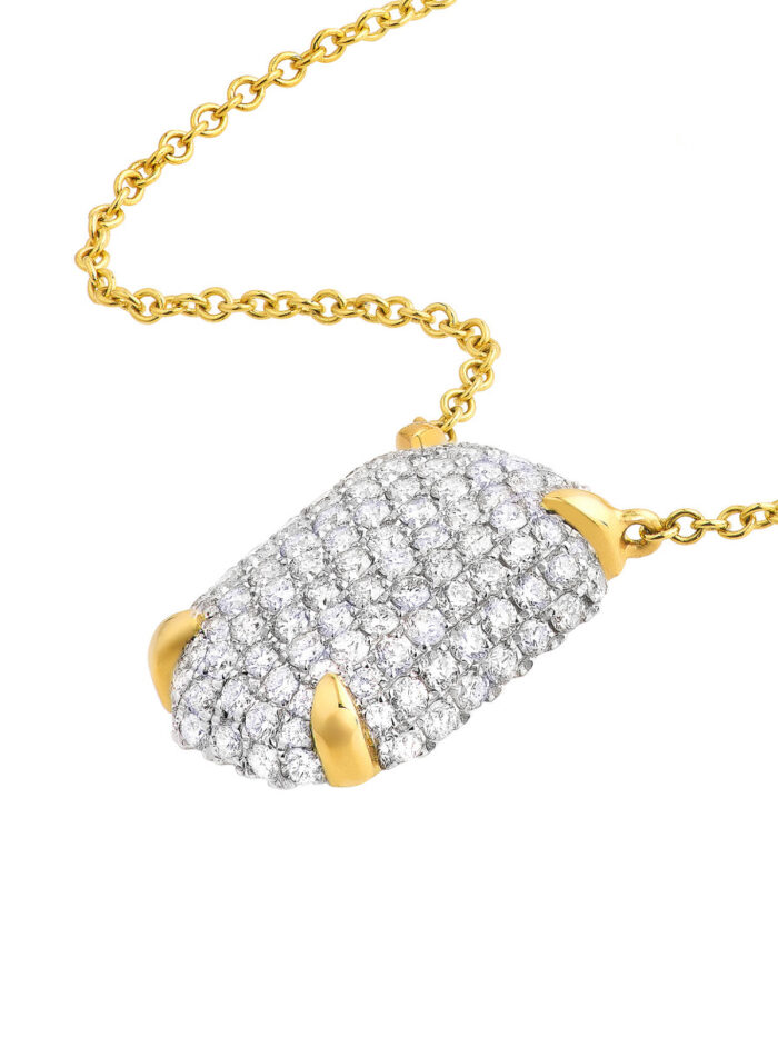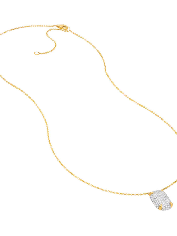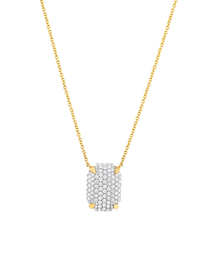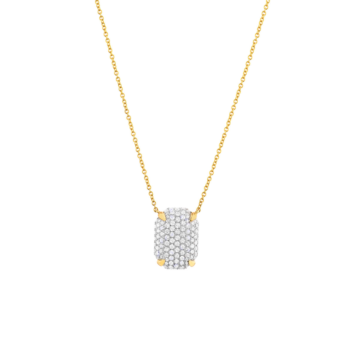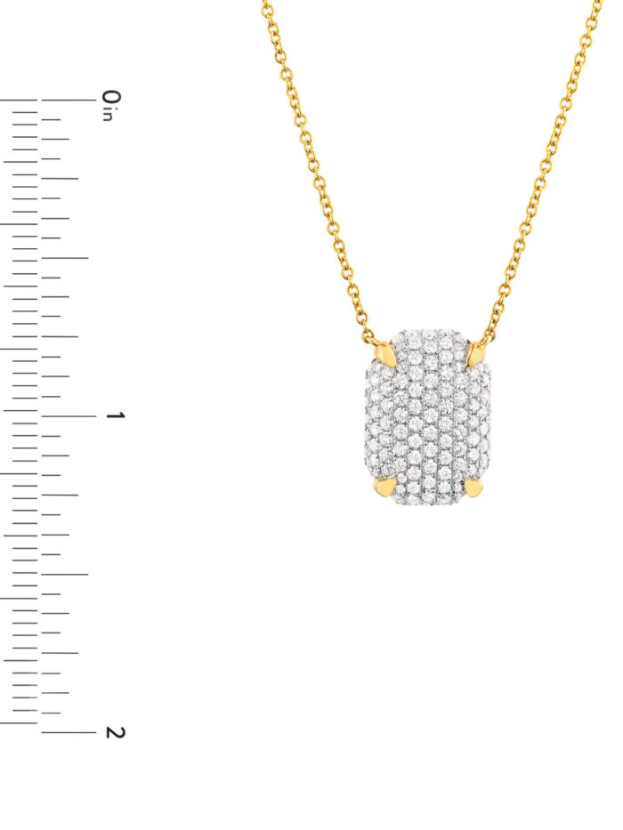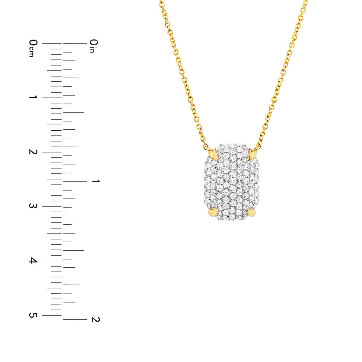 Embrace timeless elegance with the dazzling Diamond Pave Rectangle Pendant Necklace. Crafted from 14K yellow and white gold, this necklace features a stunning rectangle pendant adorned with 3/4 carat total weight of pave diamonds, creating a captivating sparkle. The secure pear-shaped lobster clasp and 18-inch cable chain ensure both comfort and style. Perfect for adding a touch of luxury to any occasion.