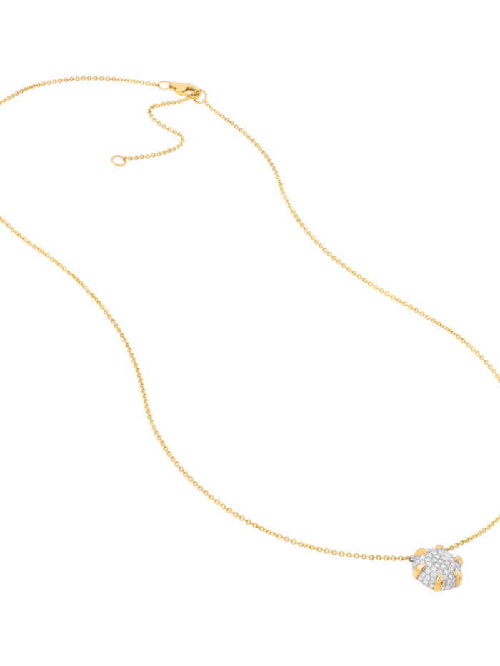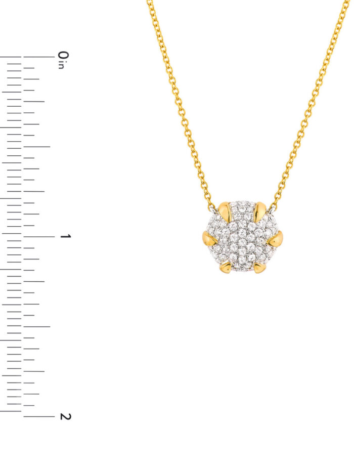 Add a touch of timeless elegance to your jewelry collection with our Diamond Pave Round Pendant Necklace. Crafted in lustrous 14K yellow and white gold, this necklace features a delicate cable chain and a stunning 3/8 carat of brilliant diamonds set in a pave pattern, creating a dazzling display of sparkle.