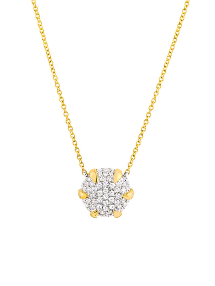Add a touch of timeless elegance to your jewelry collection with our Diamond Pave Round Pendant Necklace. Crafted in lustrous 14K yellow and white gold, this necklace features a delicate cable chain and a stunning 3/8 carat of brilliant diamonds set in a pave pattern, creating a dazzling display of sparkle.