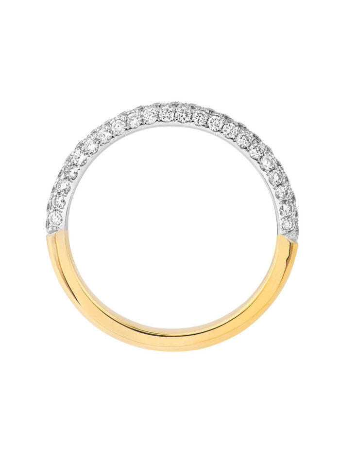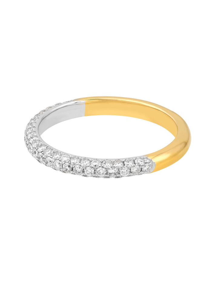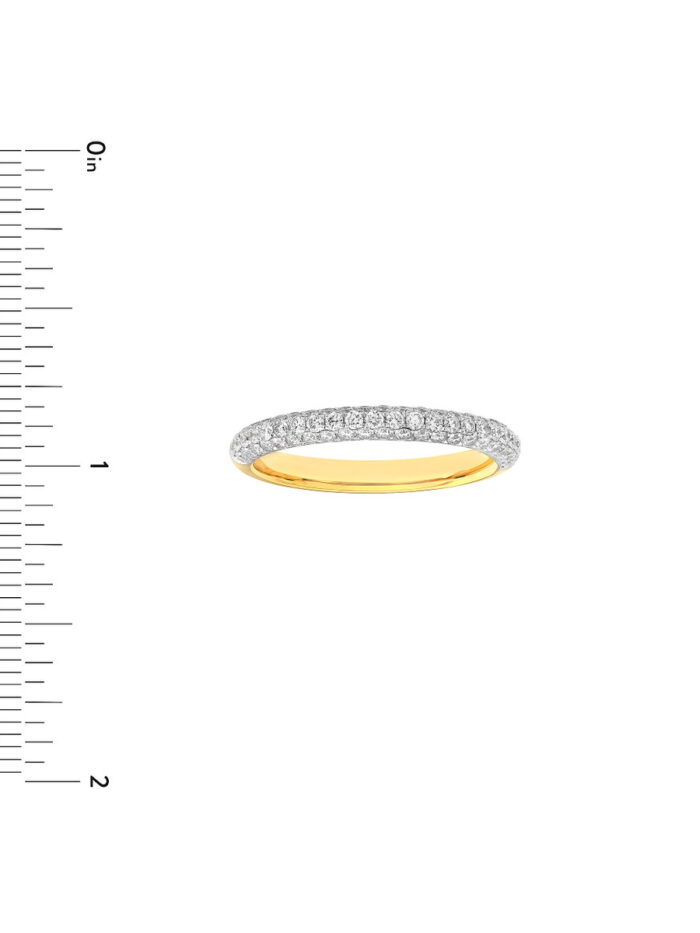 Add a touch of sparkle to your everyday style with this elegant Diamond Pave Stackable Band. Crafted from lustrous 14K yellow and white gold, this band features a captivating pave setting that showcases 0.58 carats of brilliant diamonds, set halfway along the band for a touch of glamour. The stackable design allows you to personalize your look by wearing it alone or combining it with other rings from our collection. This band is the perfect way to add a touch of luxury and sophistication to any outfit.