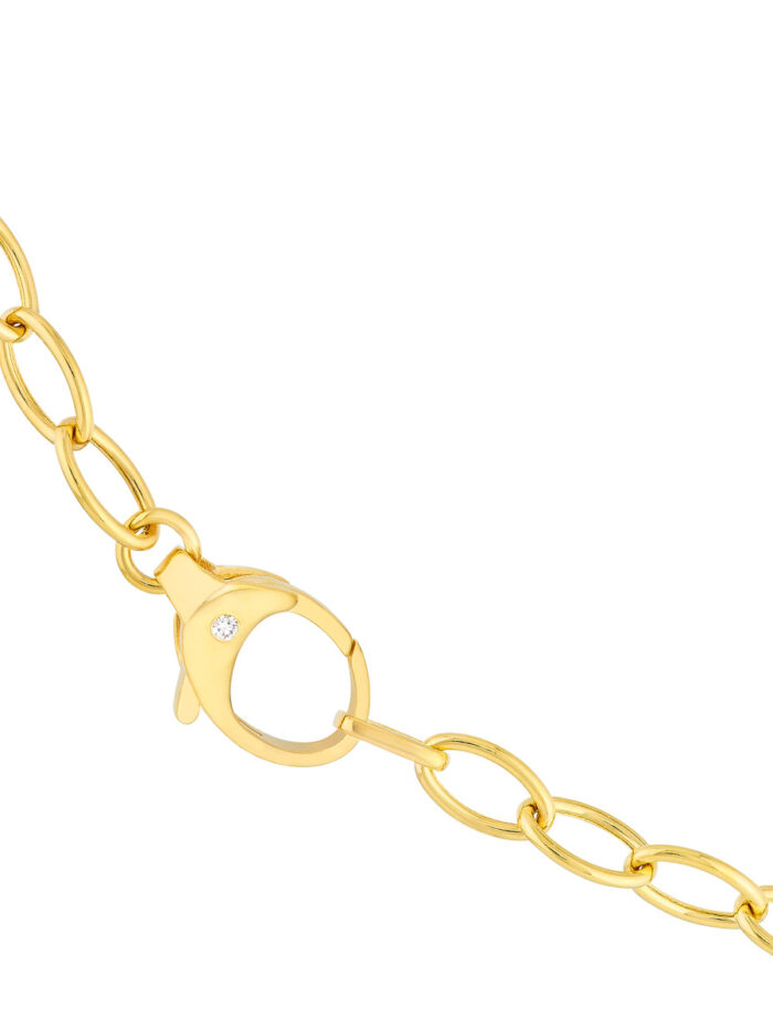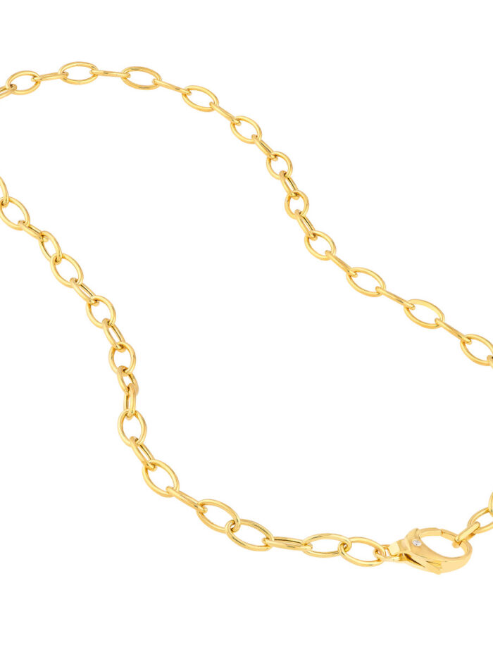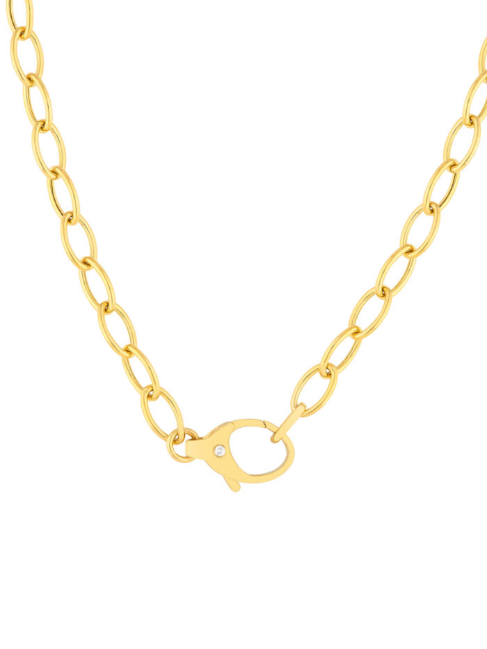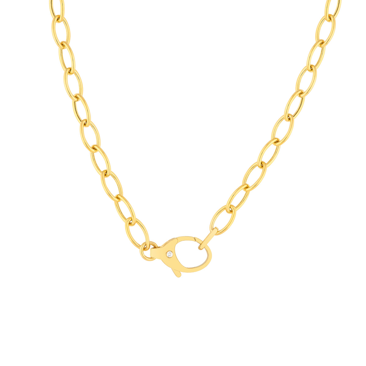Make a statement with the luxurious Diamond Pear Lock Oval Link Chain. This stunning chain is crafted from solid 14K yellow gold and features elegant oval links, each accentuated by a sparkling diamond. The unique pear-shaped lock adds a touch of sophistication. At 18 inches in length, this chain is the perfect way to add a touch of glamour to any outfit.