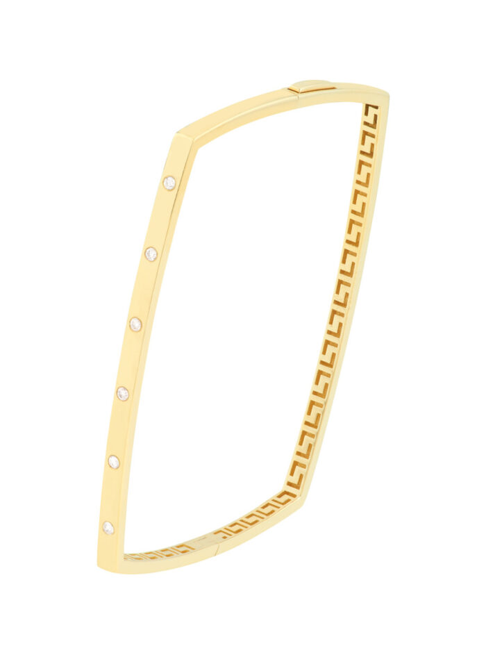 Exude elegance with this stunning Diamond Square Bangle. Crafted from gleaming 14K Yellow Gold, it features a sparkling diamond accent and a unique Greek Key interior design. This bangle is a chic and sophisticated accessory that can be worn for both casual and formal occasions. Its comfortable fit ensures all-day wearability, making it a timeless addition to your jewelry collection.