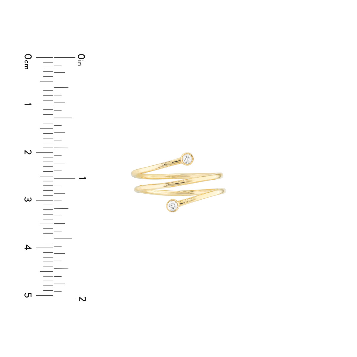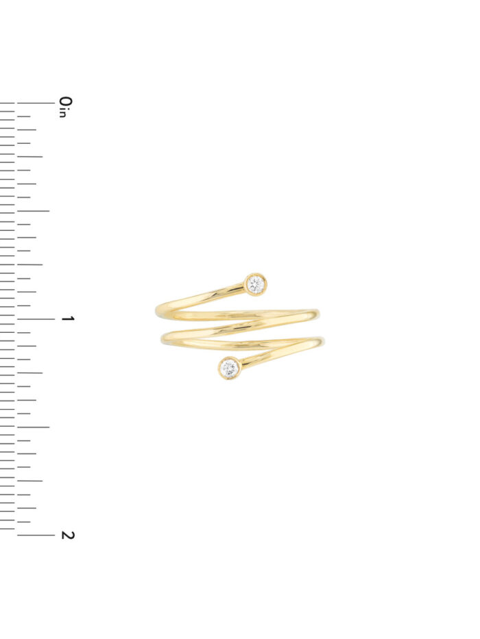 You’ll fall in love with this elegant wrap ring. This stunning ring is crafted in lustrous 14K yellow gold and features two captivating bezel-set diamonds, adding a touch of sparkle and sophistication. The wrap-around design creates a sleek and modern look, perfect for everyday wear. It’s a timeless piece that will elevate any outfit.