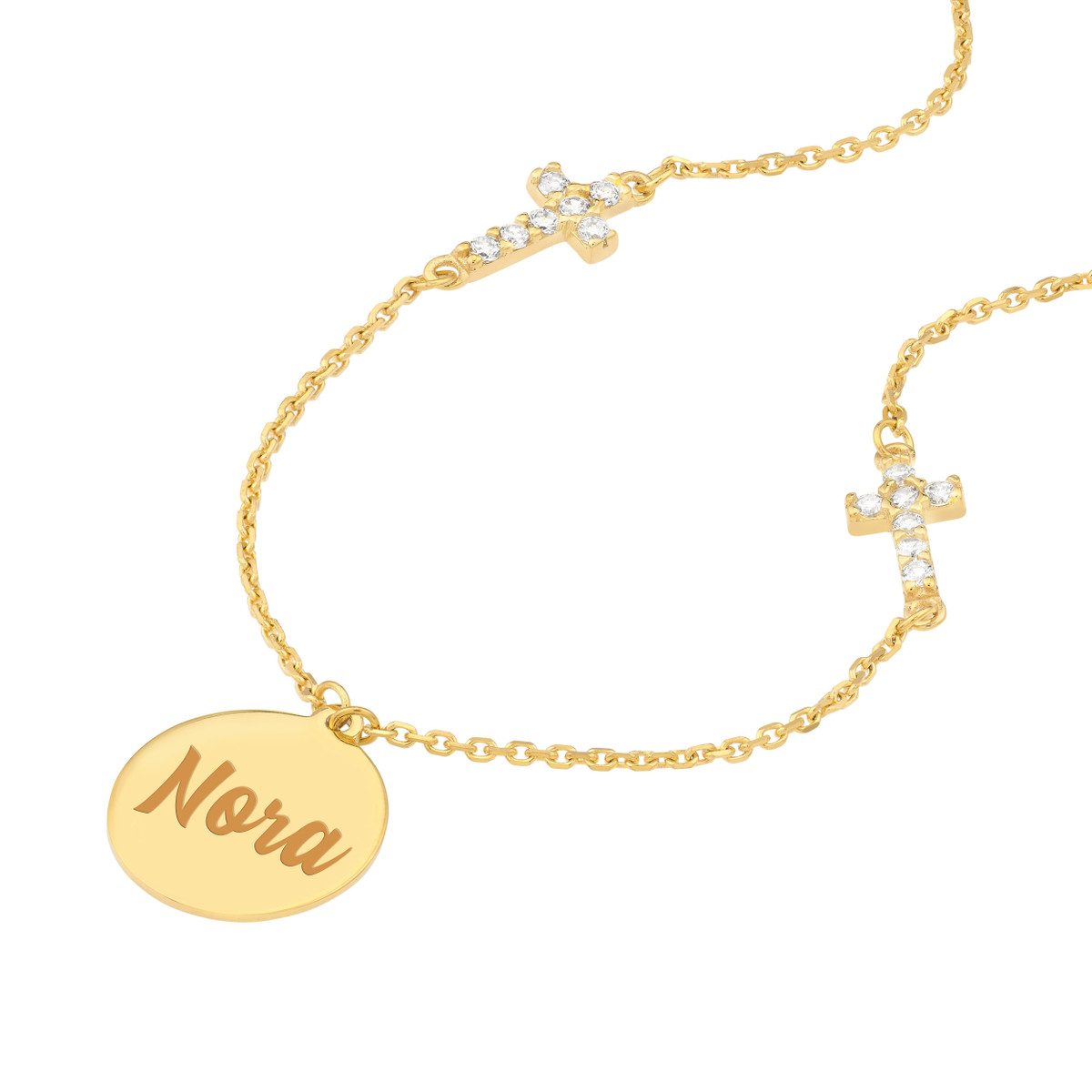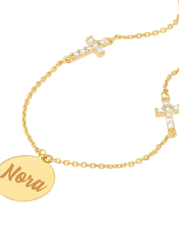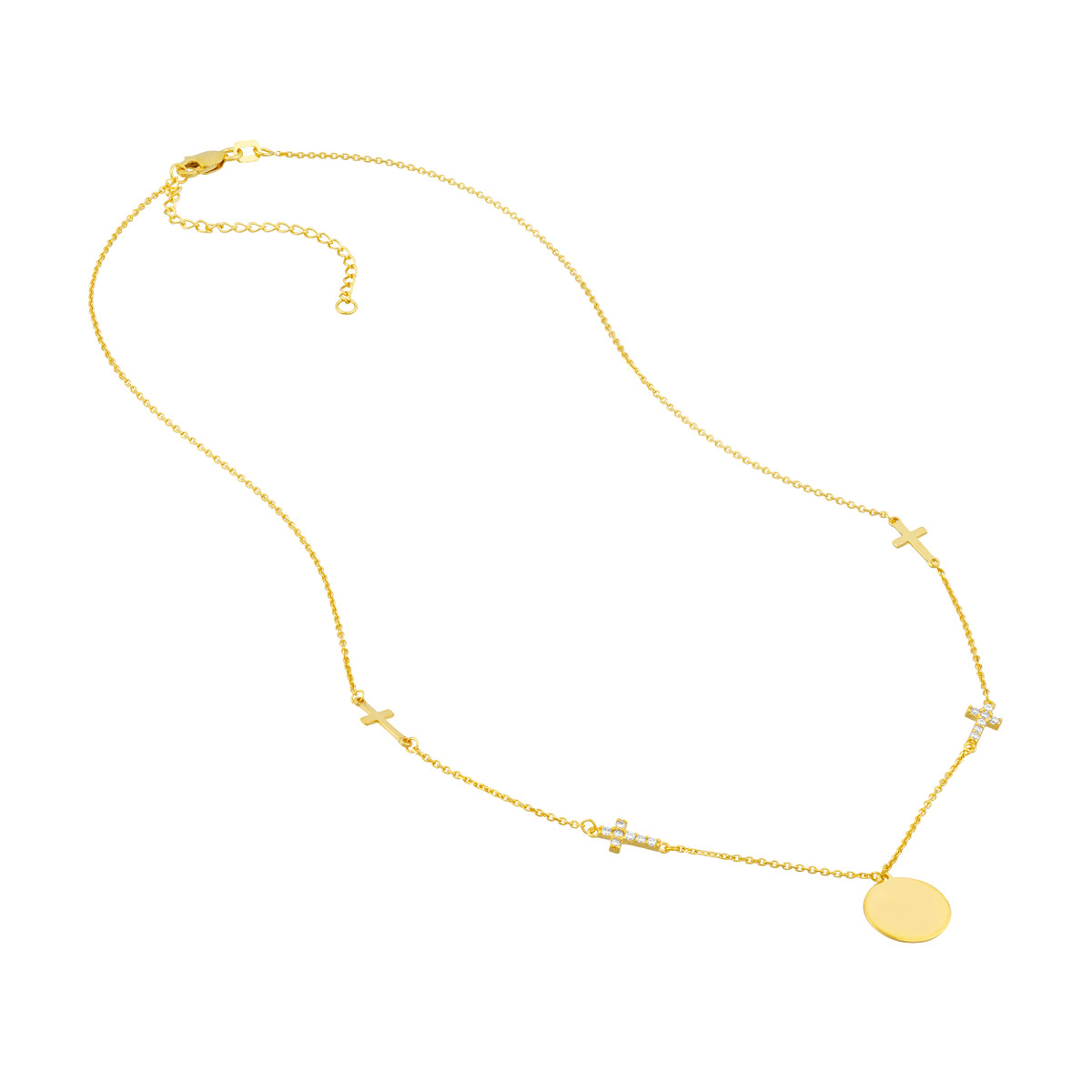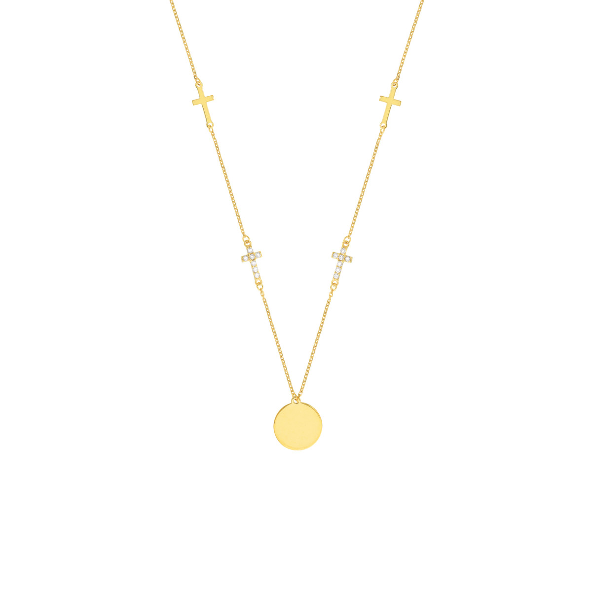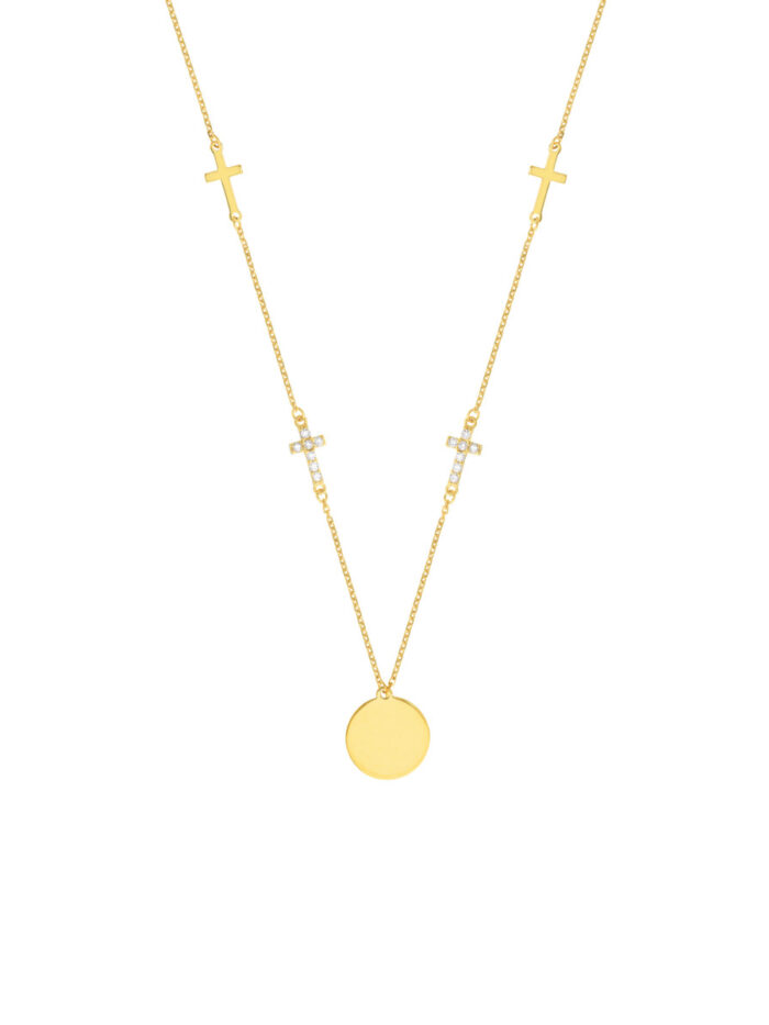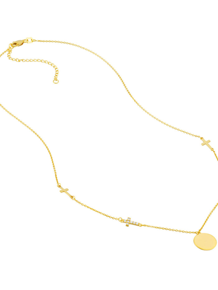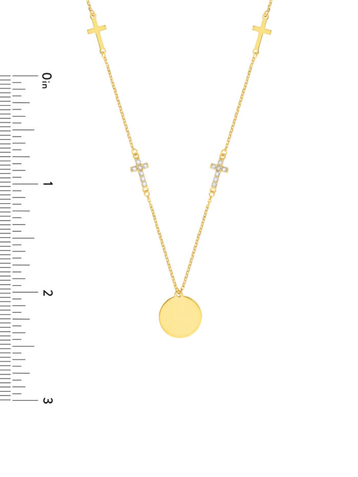 Make a statement with the Disc Necklace with Cross Stations. This beautiful necklace features an engravable disc, allowing you to personalize it with a special message or date. Two polished cross stations and two cubic zirconia cross stations add a touch of sparkle and faith-inspired elegance. The necklace hangs from a delicate cable chain and is adjustable, ensuring the perfect fit.