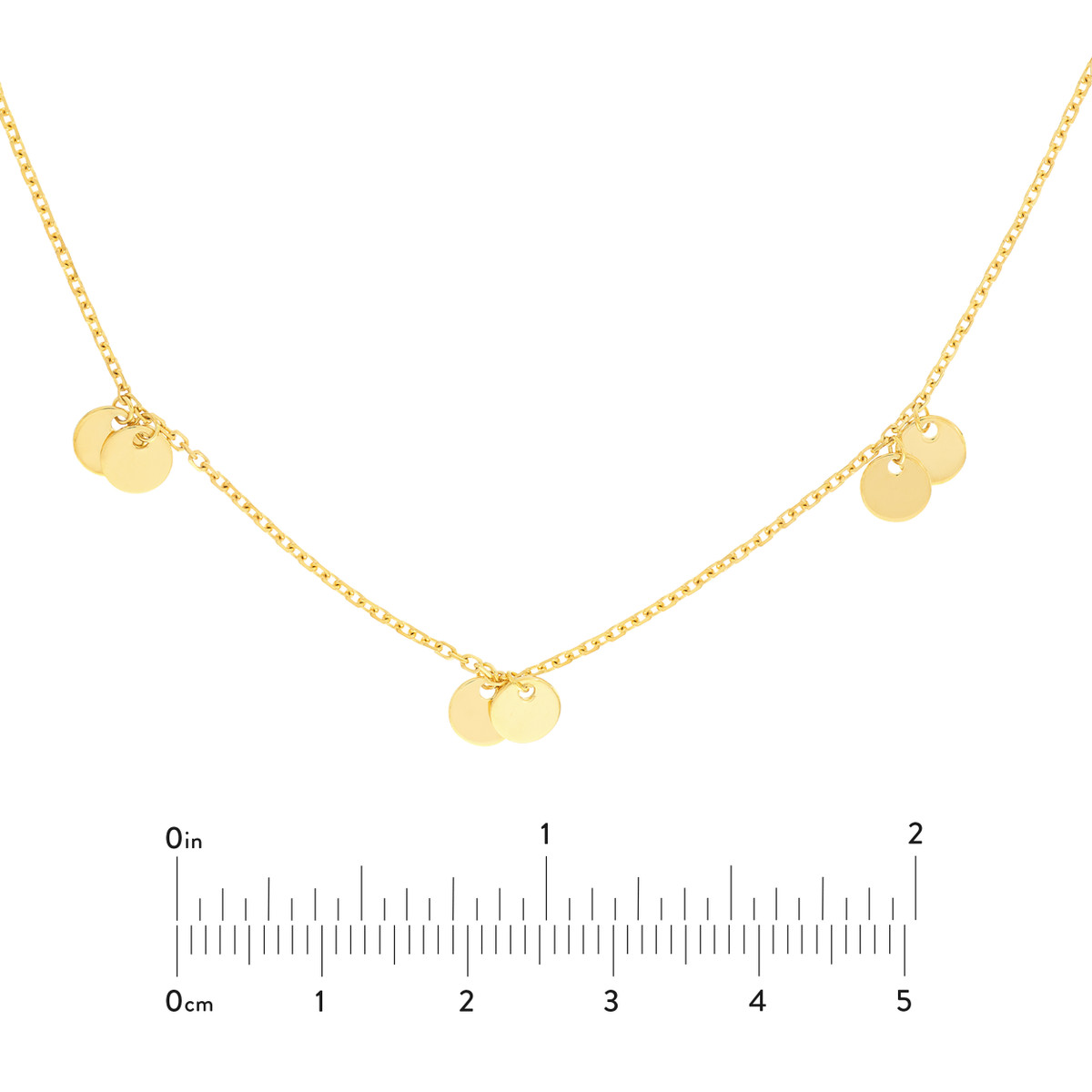 Embrace bohemian charm with this captivating double disc dangle necklace. Crafted from 14K yellow gold, this adjustable necklace features five gracefully dangling double discs, creating a beautiful and eye-catching design. The cable chain adds a touch of classic elegance, while the secure lobster closure ensures comfortable wear.