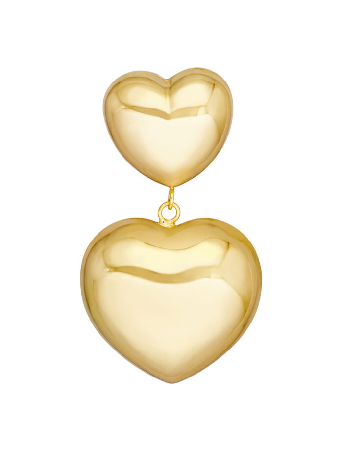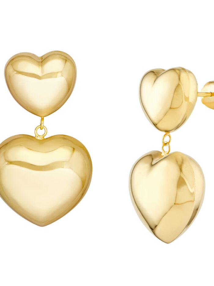 Embrace whimsy and charm with these delightful Double Puff Heart Dangle Earrings. Crafted from lustrous 14K yellow gold, these earrings feature a playful double puff heart design that adds a touch of cuteness to any outfit. The secure post and nut closure ensures comfortable wear.
