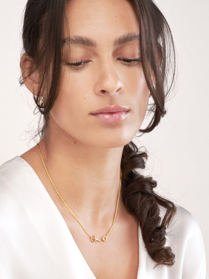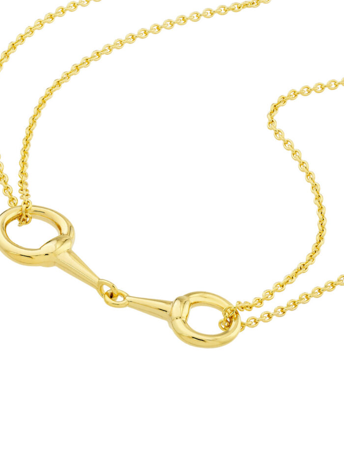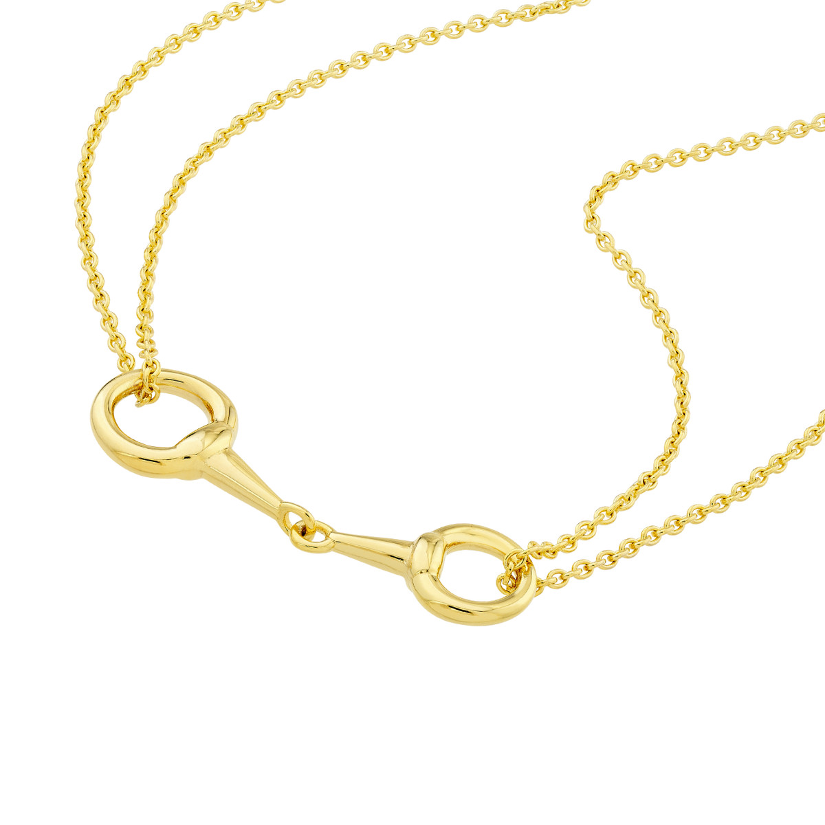 Turn heads with this eye-catching double strand horse bit necklace. Crafted from lustrous 14K yellow gold, this unique design features two delicate horse bit elements suspended from a classic cable chain. The adjustable 18-inch length allows for a personalized fit, making it perfect for layering or wearing solo. A timeless piece that effortlessly elevates any outfit.